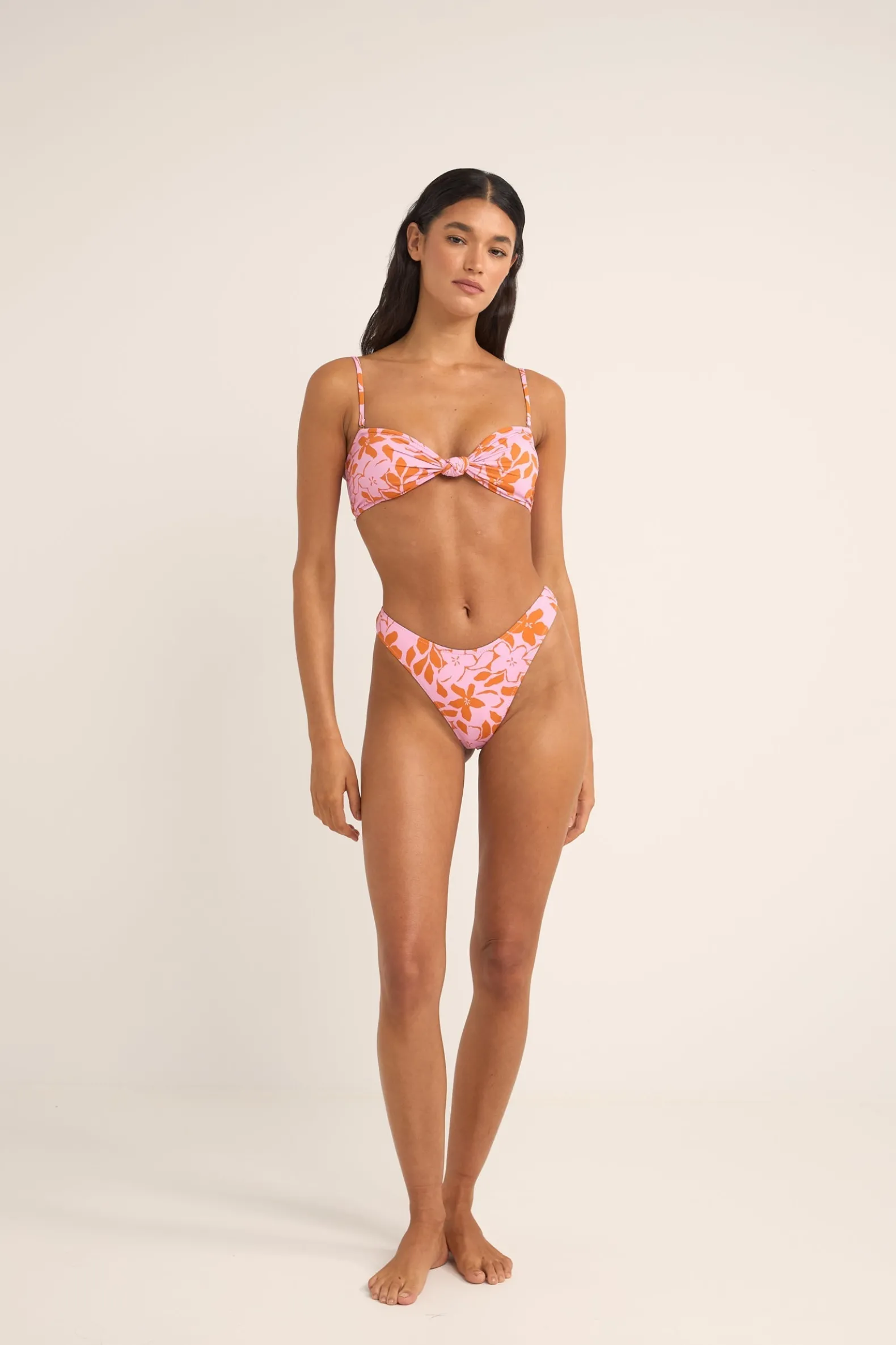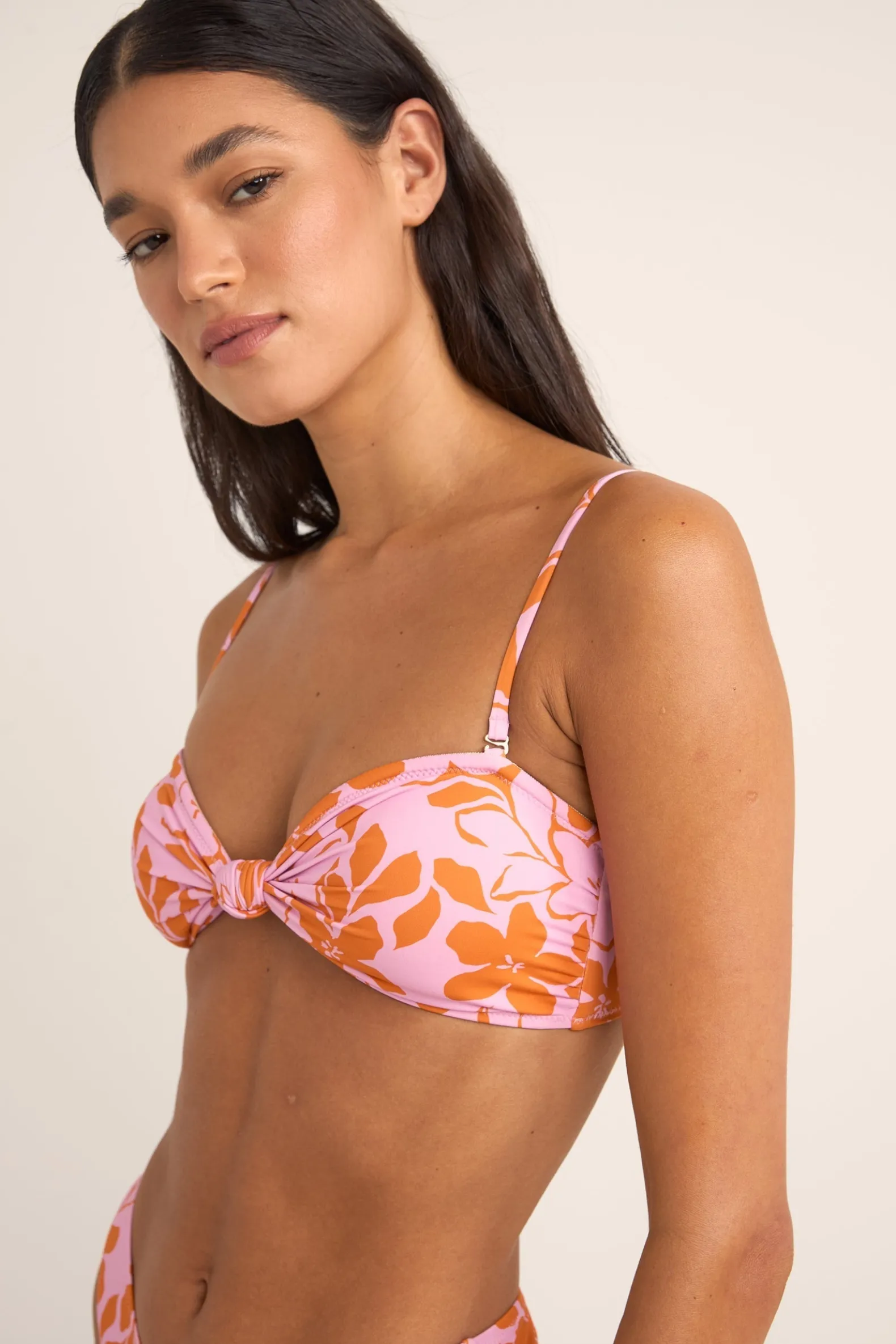 The Bora Bora Knotted Bandeau Top in Pink brings a touch of romance to your beach wardrobe. Featuring a knotted front and encased boning for added support, this top is designed for comfort with removable shoulder straps and silicone grip. Whether a seaside escape or a poolside retreat, this top promises effortless style.
