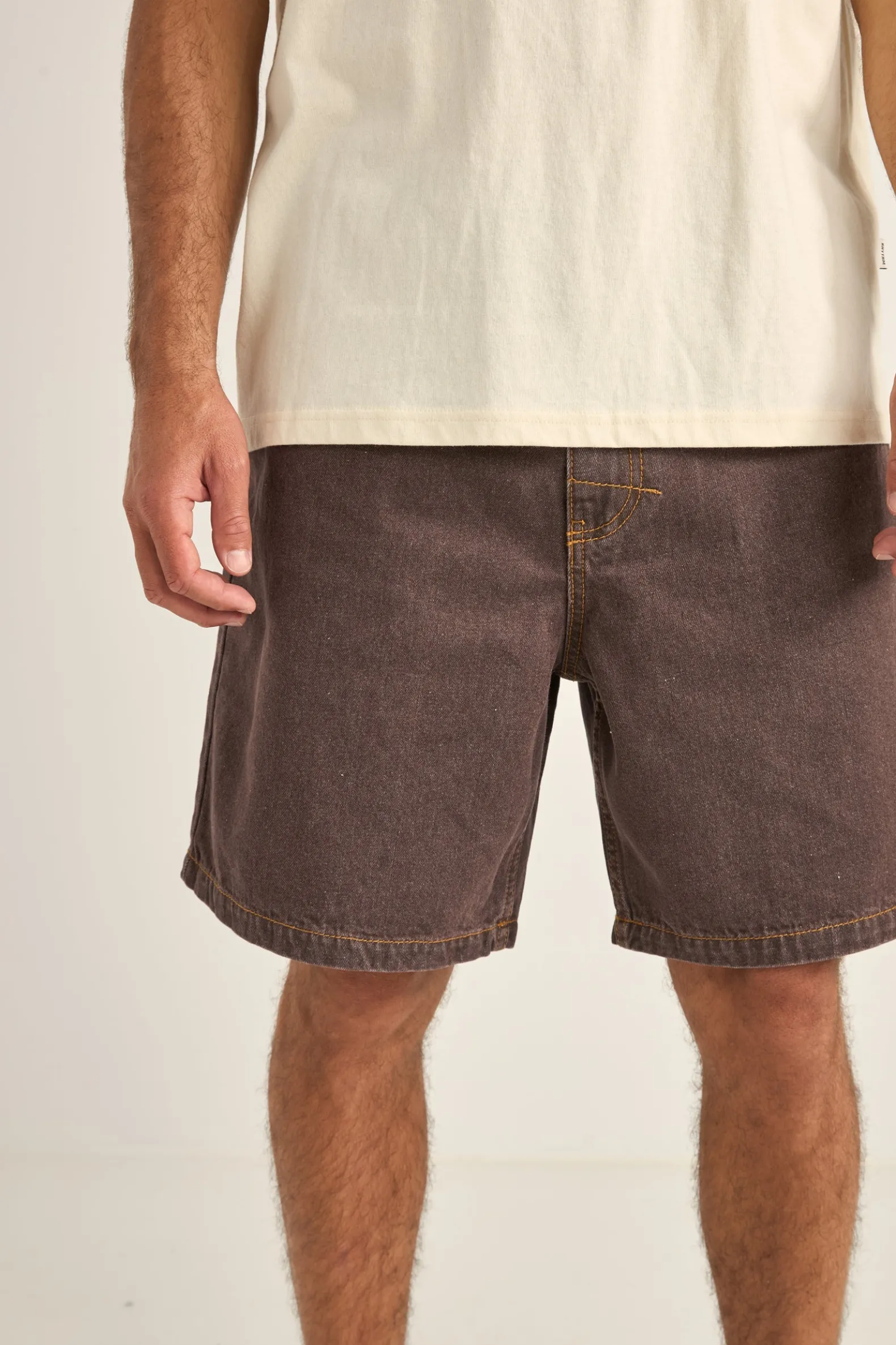 Upgrade your summer style with the Chile Denim Short in Brown. These 19-inch washed denim shorts feature brushed gold detailing, offering a perfect blend of rugged durability and coastal charm for any adventure.
