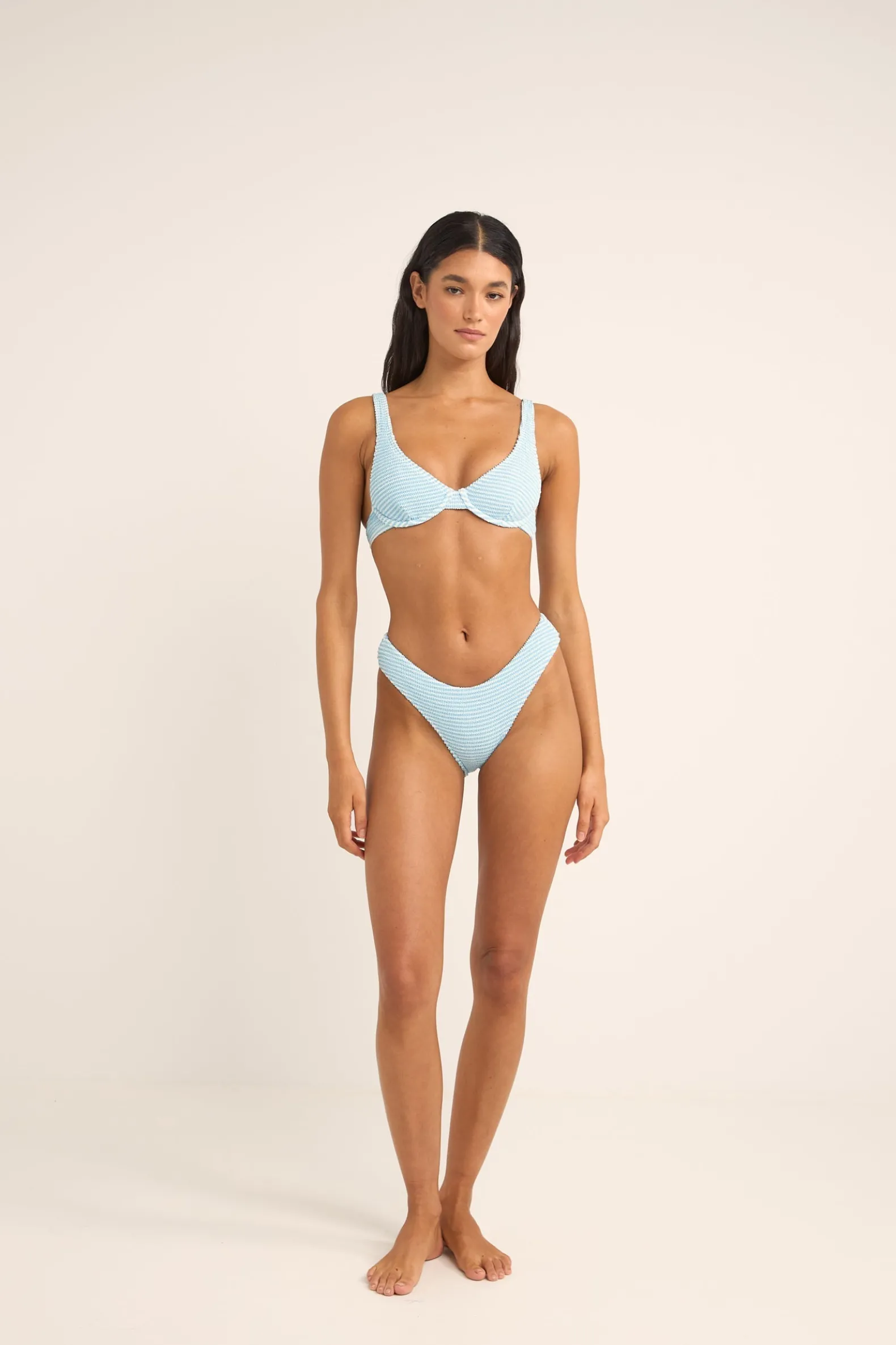Enjoy the versatility of the Cove Stripe Holiday Pant, offering moderate coverage with a mid-rise waist. Made from recycled polyester and polyamide, this pant provides comfort and coverage without compromising on style. Its clean finished edges and zig zag stitching detail are perfect for those who value sustainability and design.