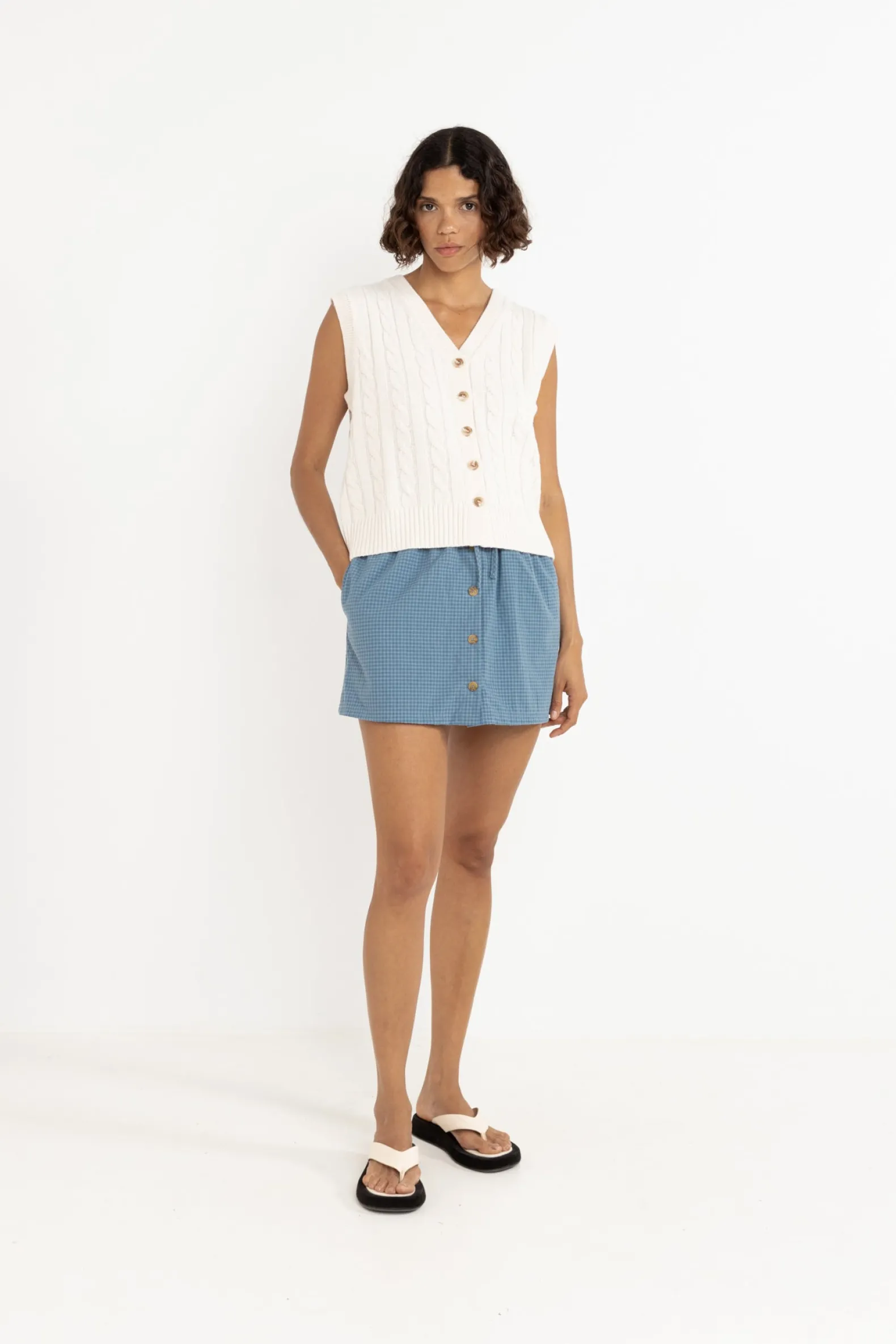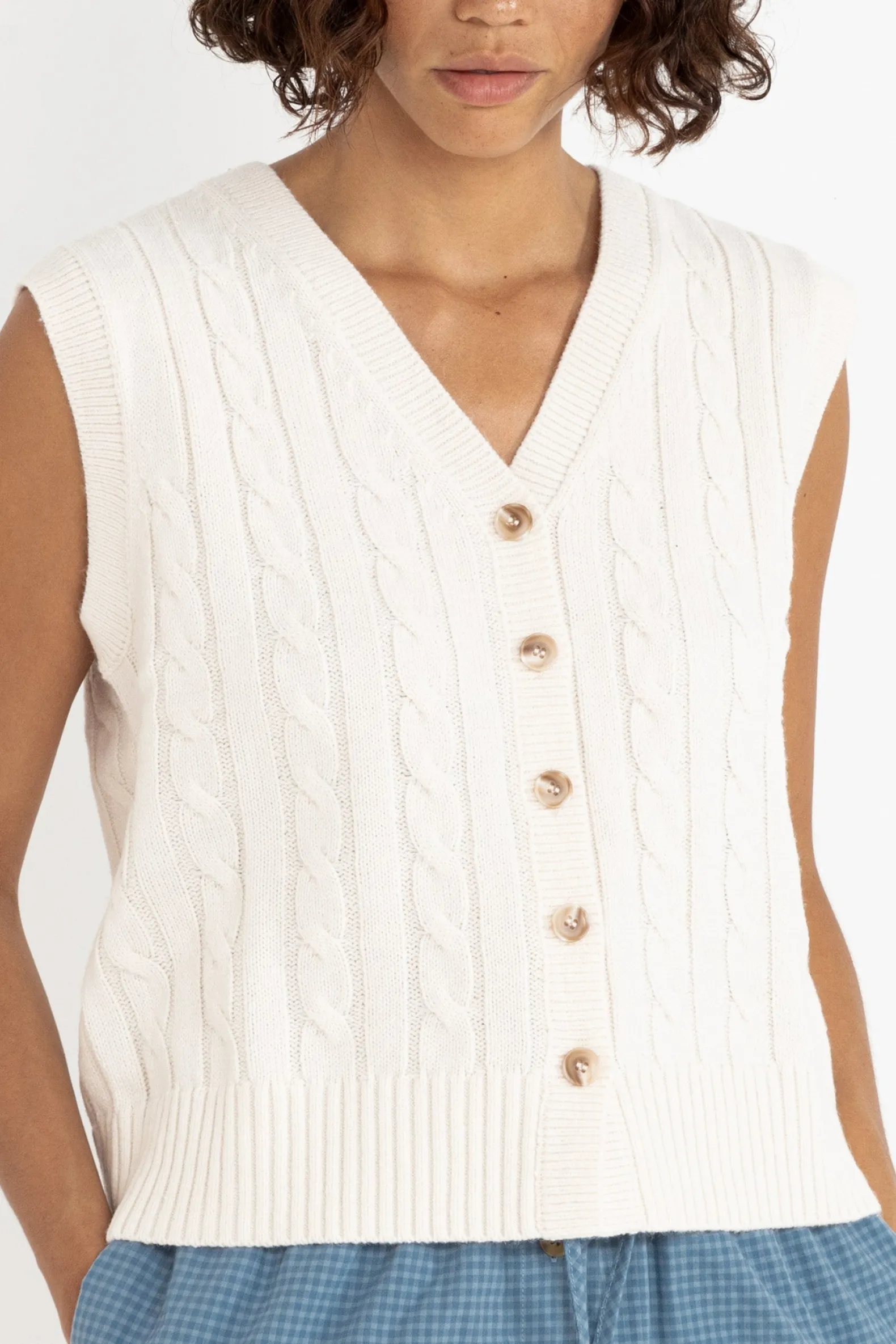 Add texture to your layers with the Desi Cable Knit Vest in Natural. This easy-to-wear piece, featuring intricate cable knit detailing, offers both warmth and style for transitional seasons.