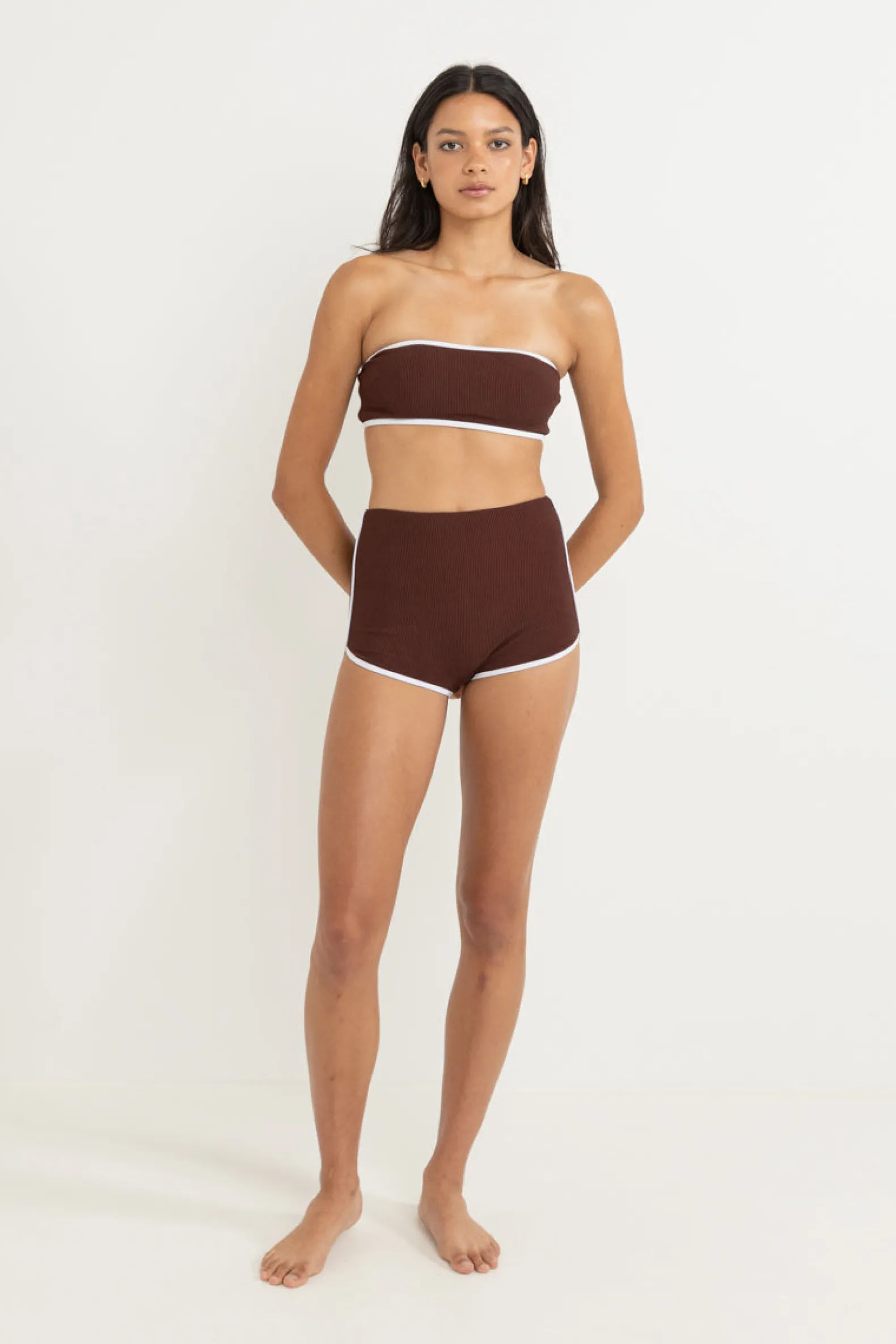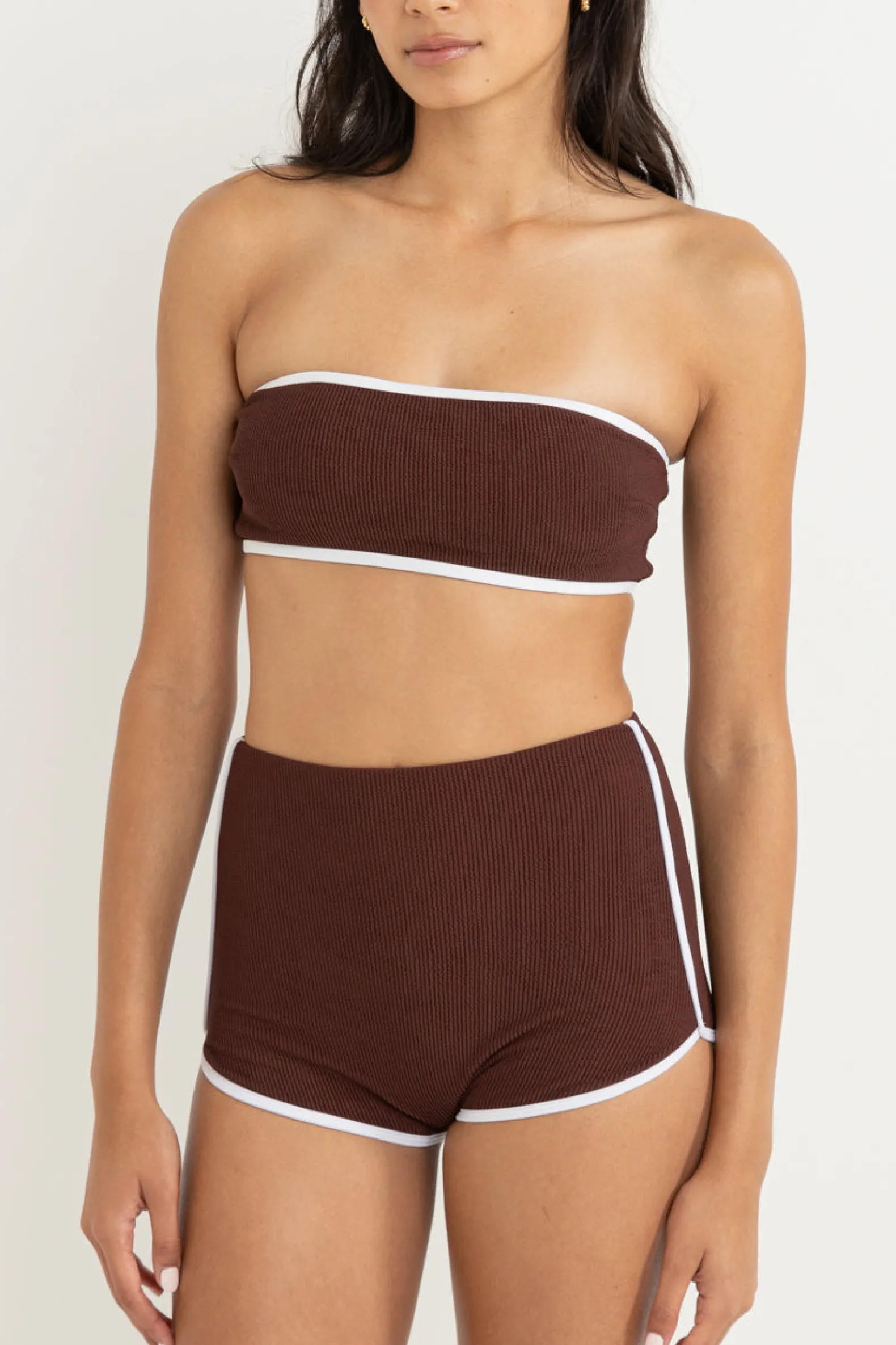 This café bandeau is ideal for A-D cup sizes with pull-on style, removable straps, and white contrast binding. Finished with a Rhythm metal coin logo for effortless beach chic.