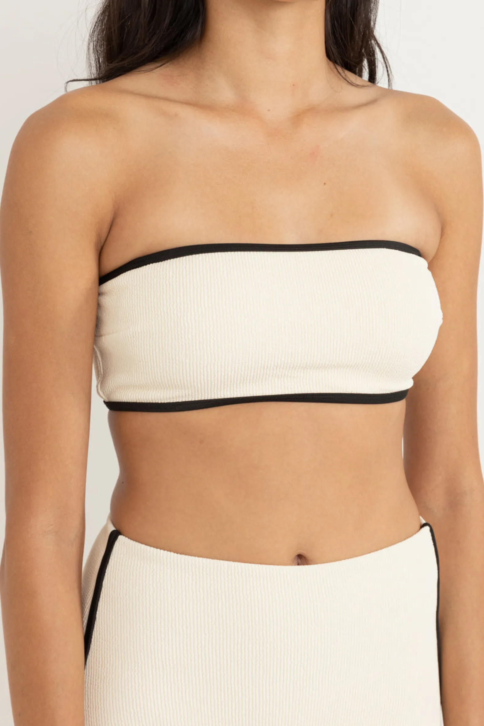 The crème bandeau top features a pull-on style and adjustable straps, offering versatility for A-D cup sizes. White contrast binding and the Rhythm metal coin logo complete the look.