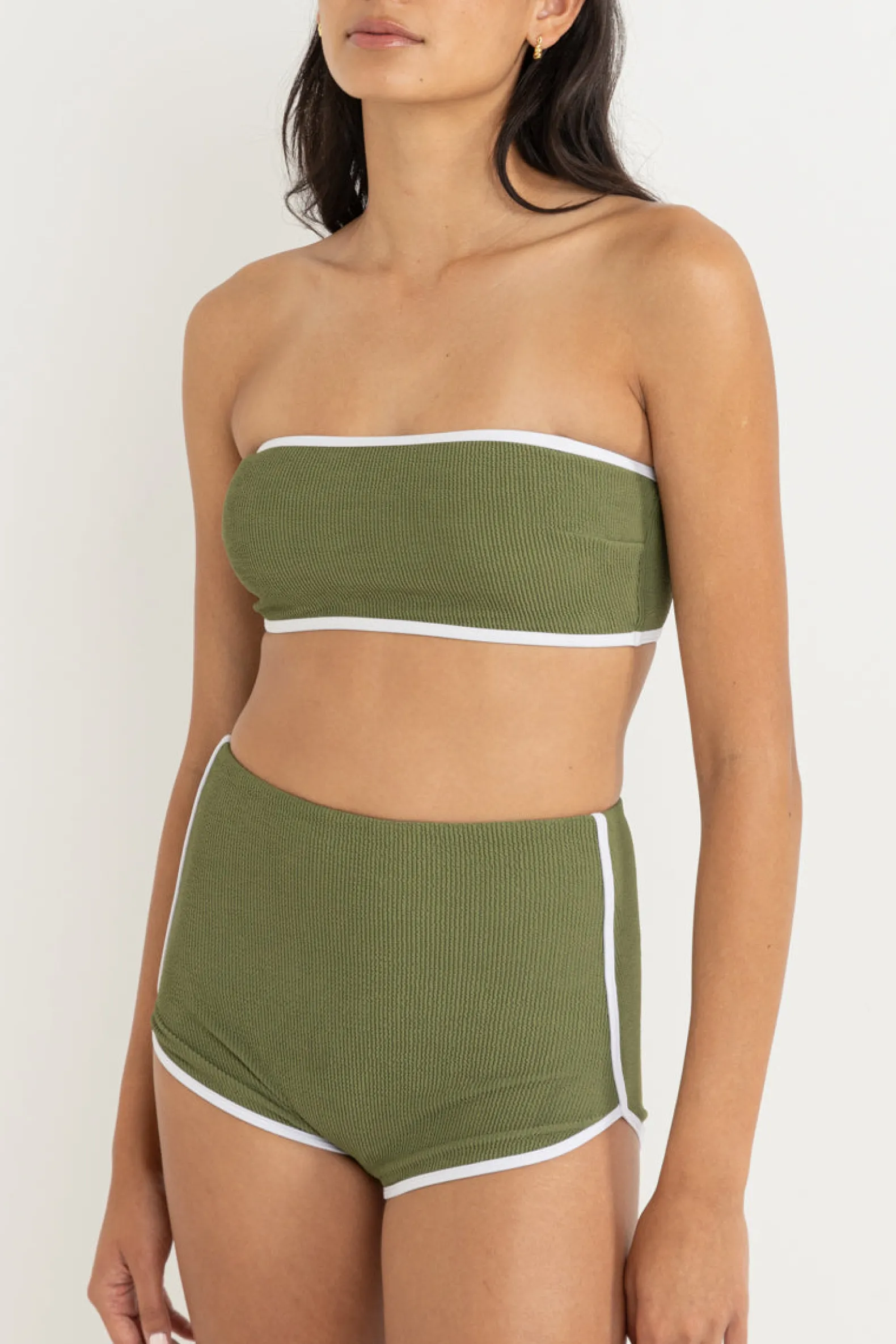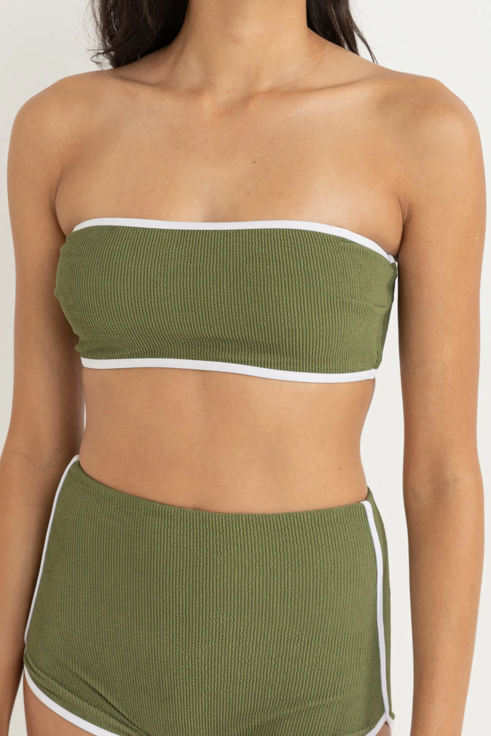 This olive-toned bandeau top, perfect for A-D cup sizes, features a pull-on style and removable straps. White contrast binding and the Rhythm metal coin logo add a coastal touch.