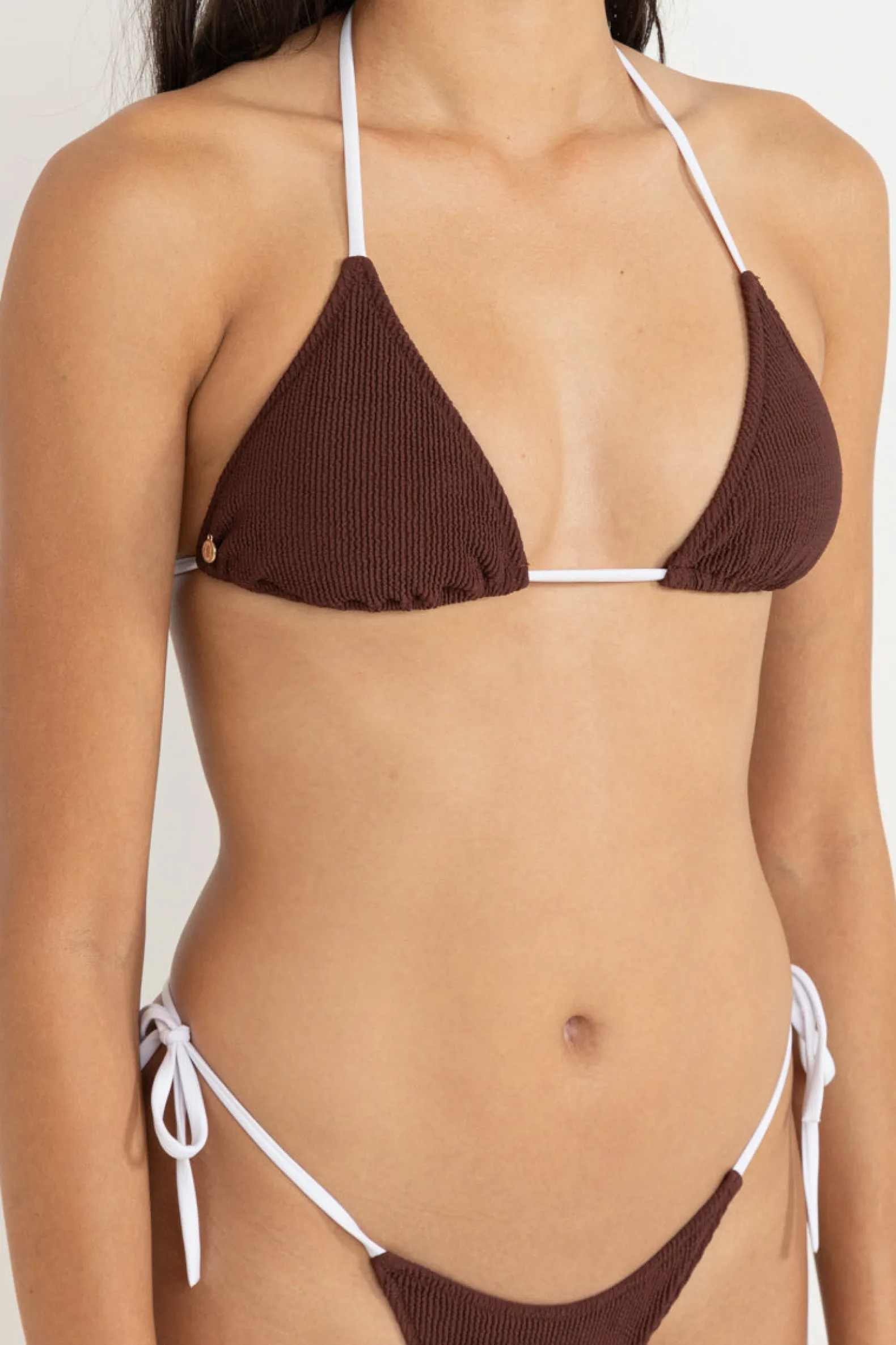 Effortlessly stylish, this café tri top features removable soft cups and black contrast binding. Adjustable straps and a signature Rhythm metal coin logo complete this coastal classic.