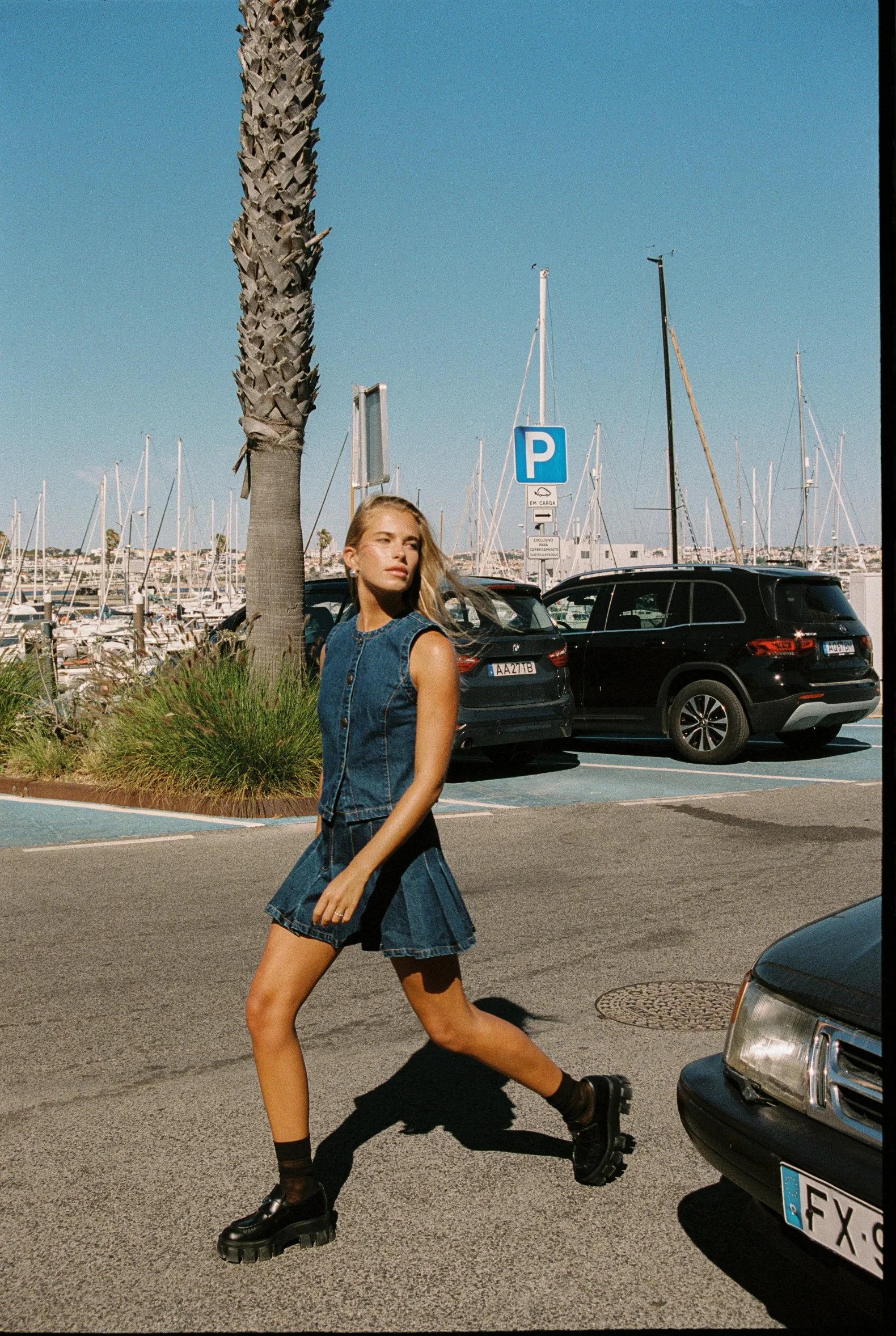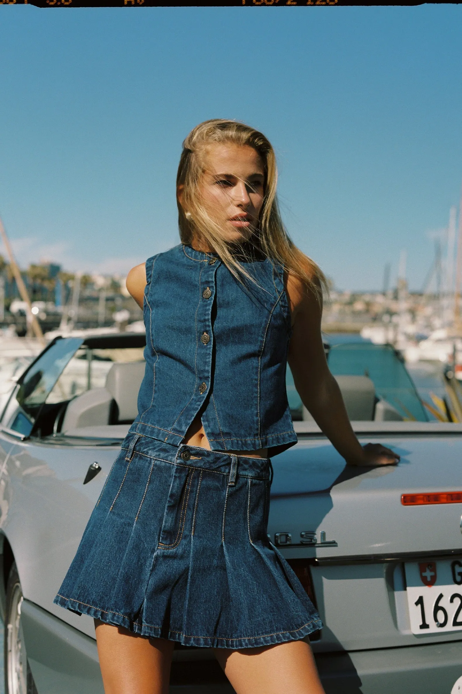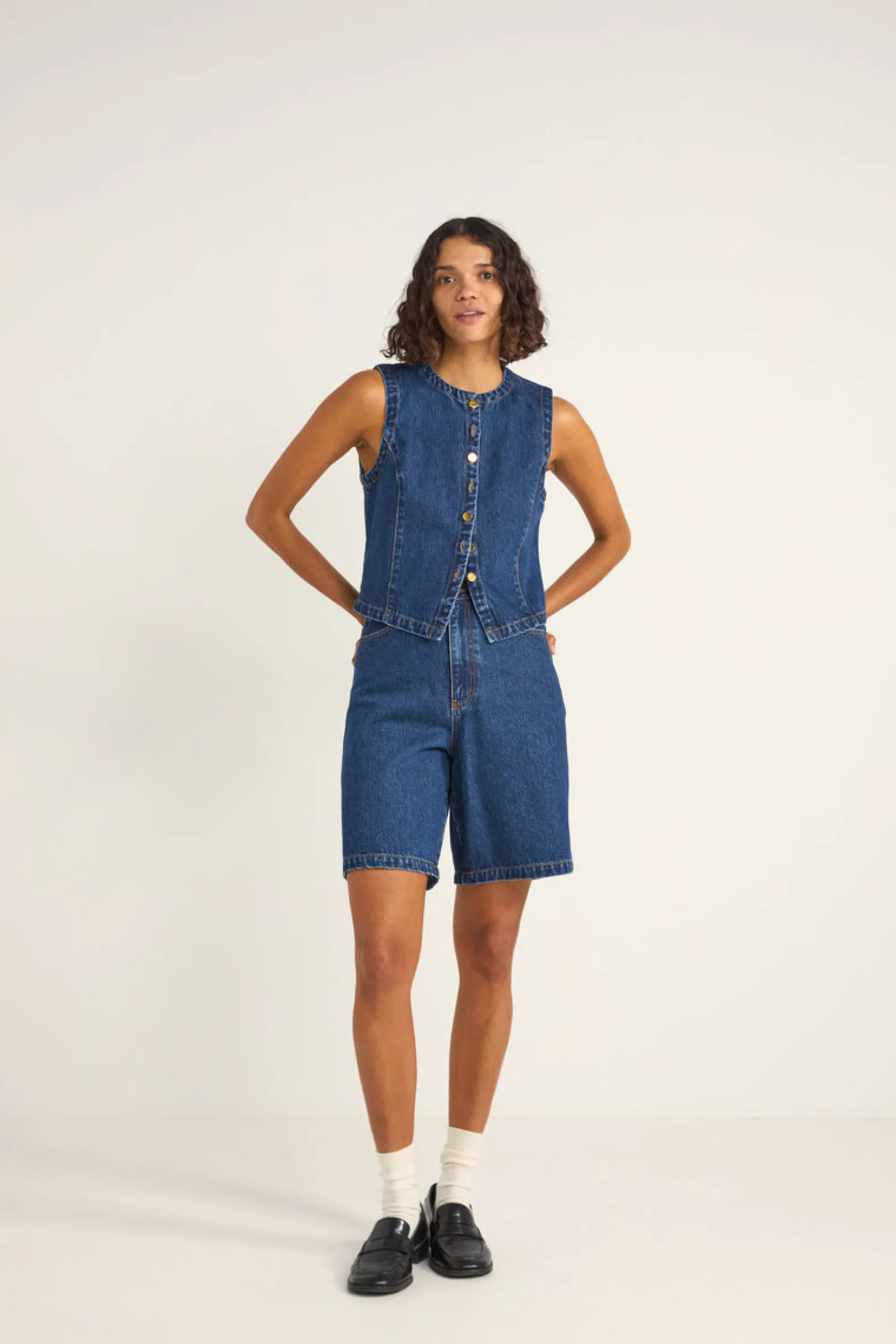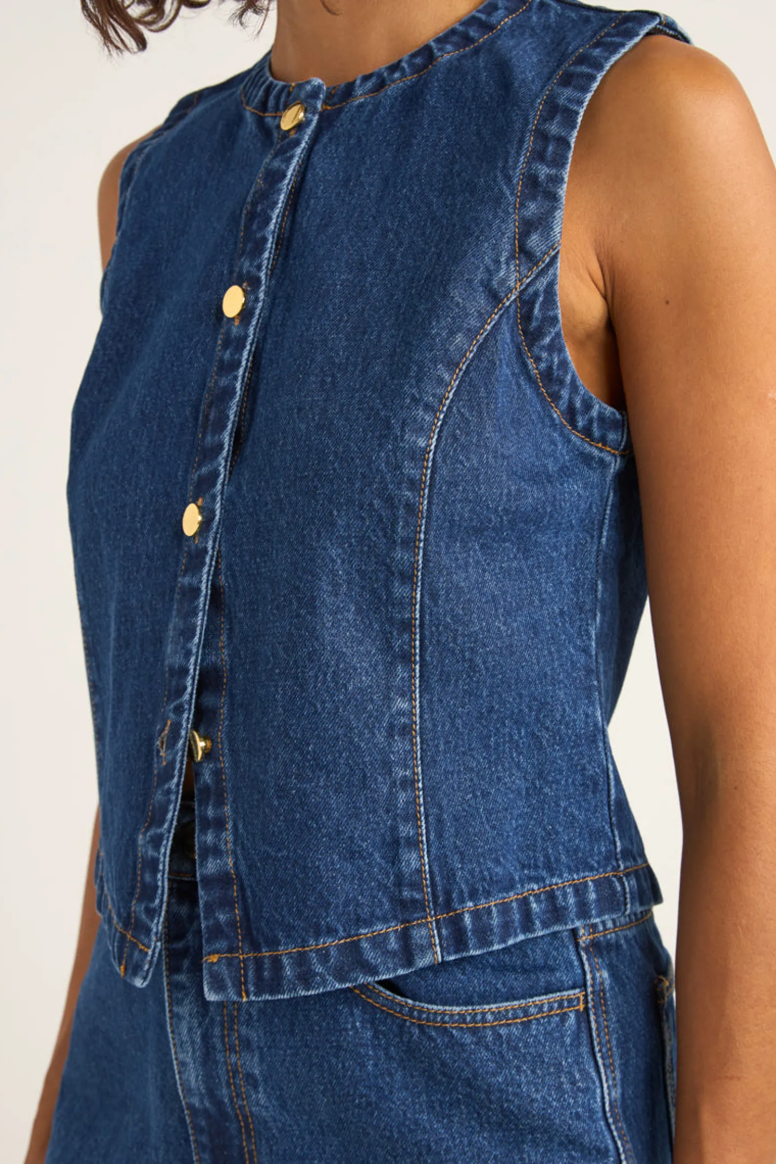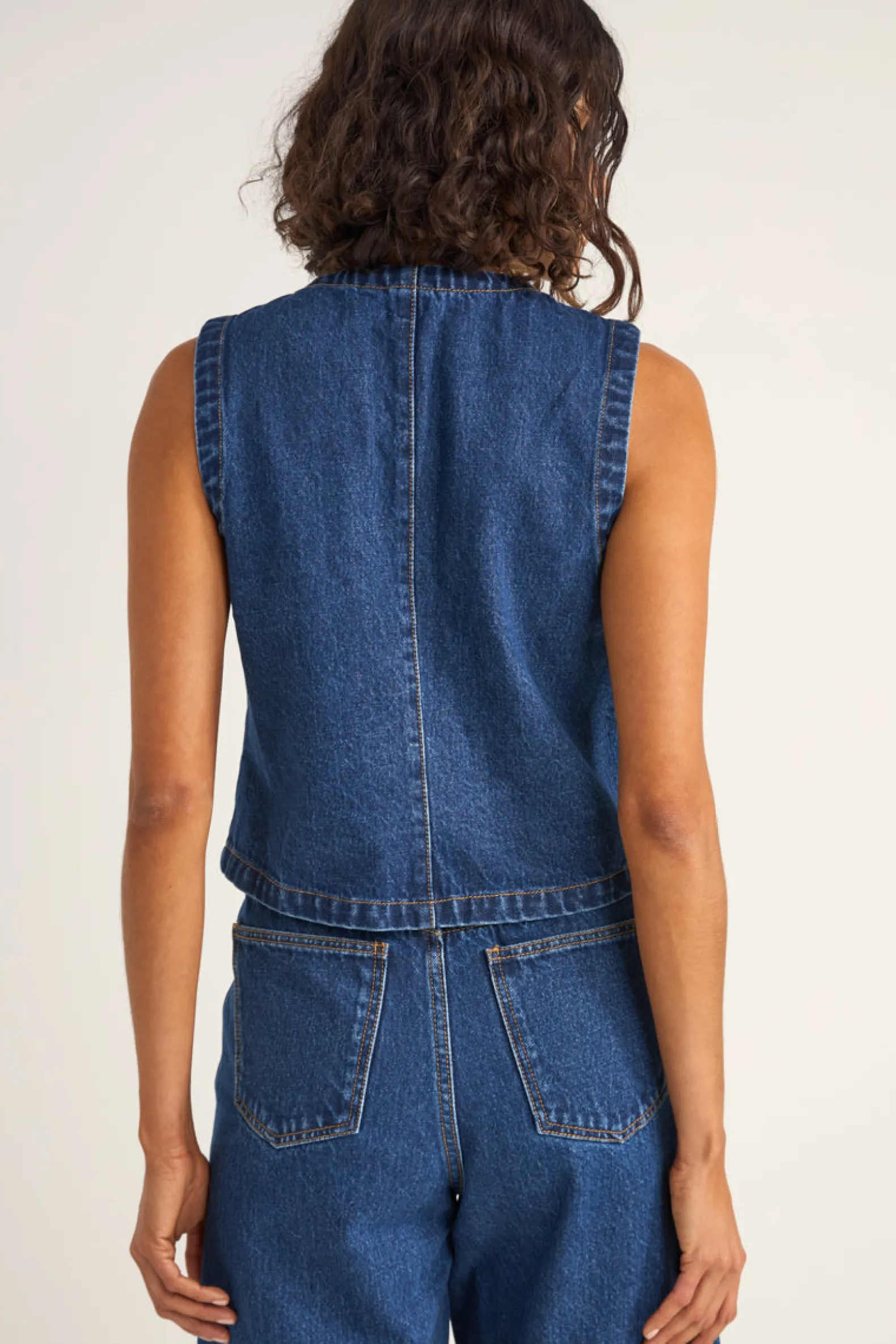 The Gia Denim Vest is a standout with its heavy-weight denim, crew neck, and button-down front. Contrast stitching adds an artisanal touch to this effortlessly cool layer.
