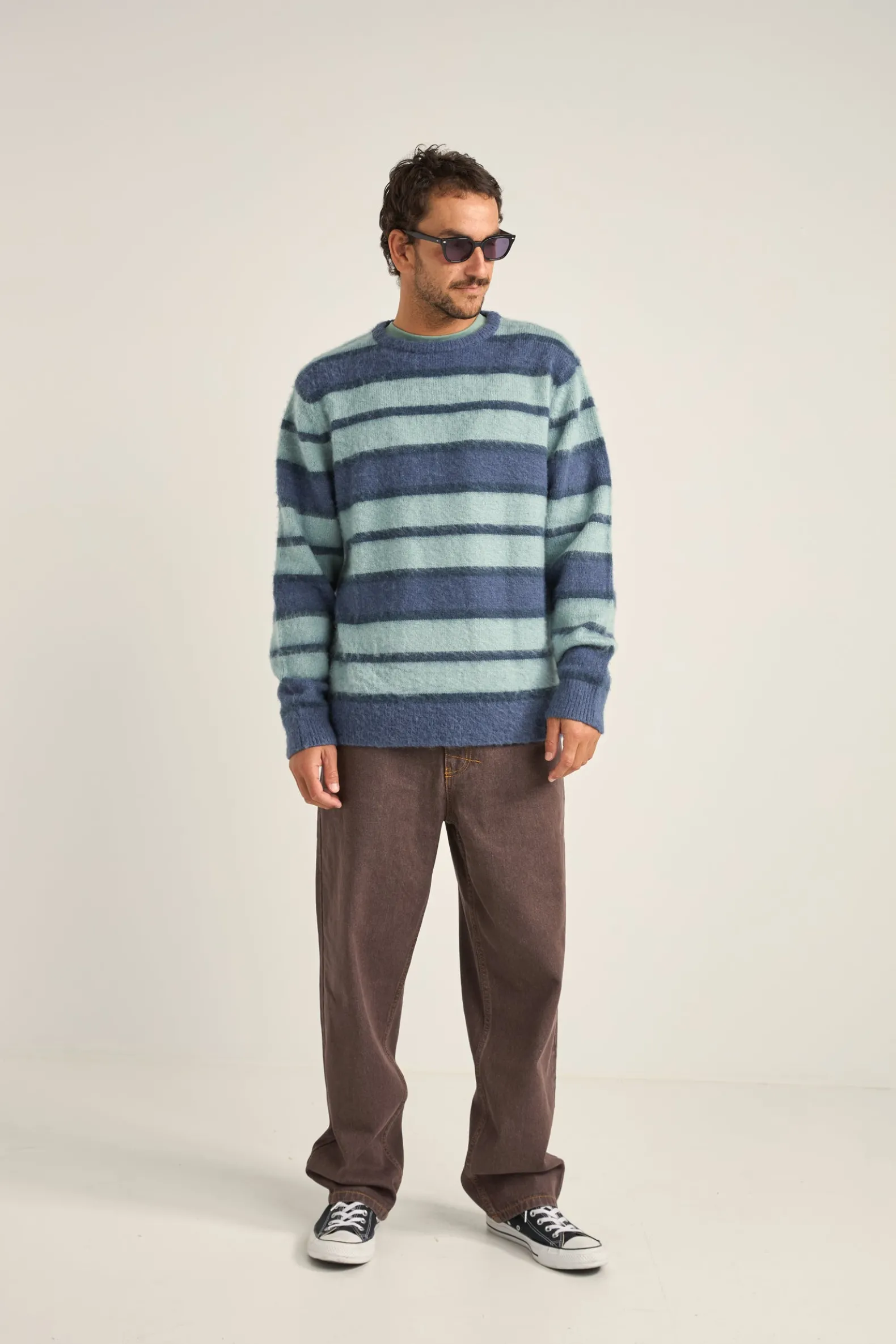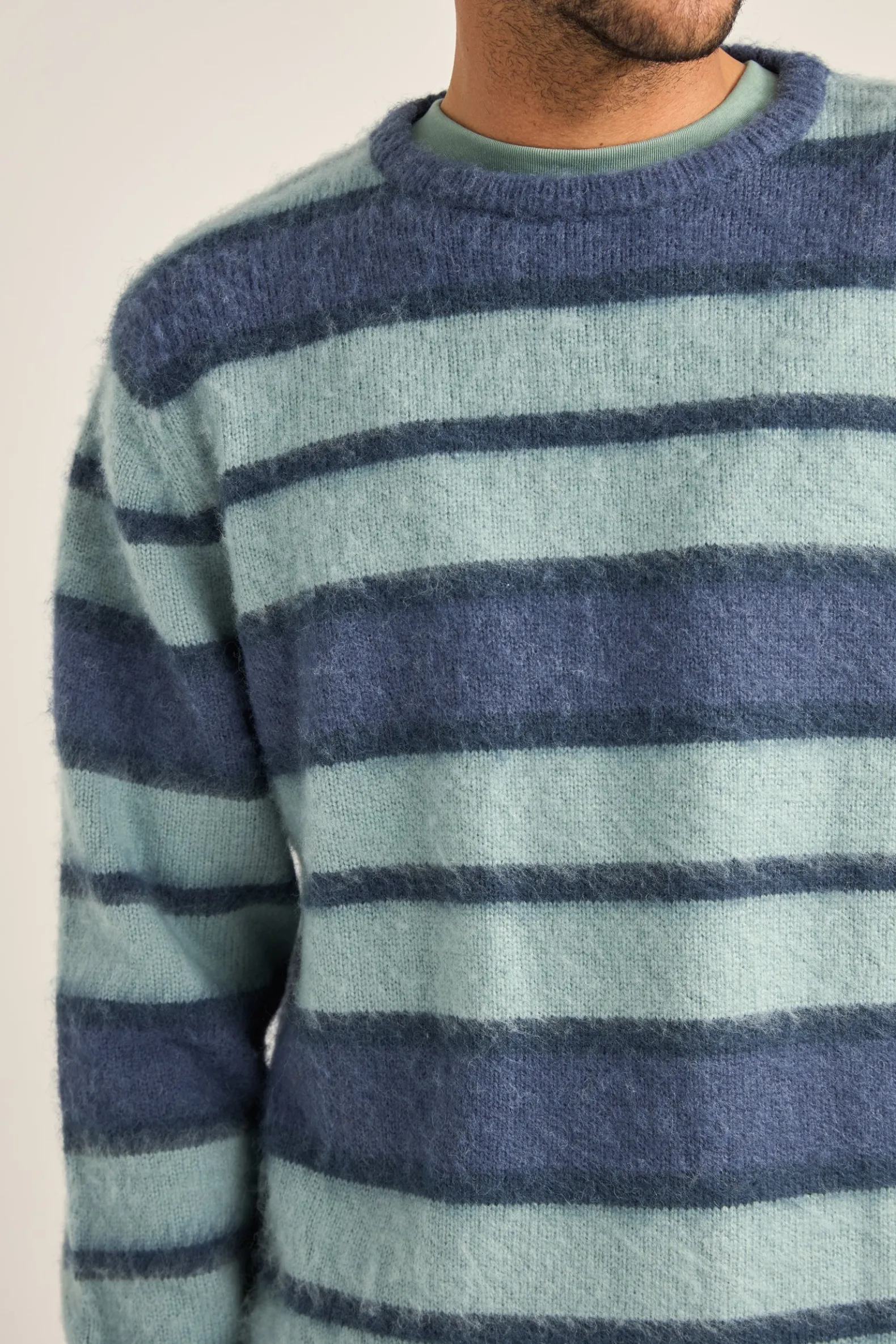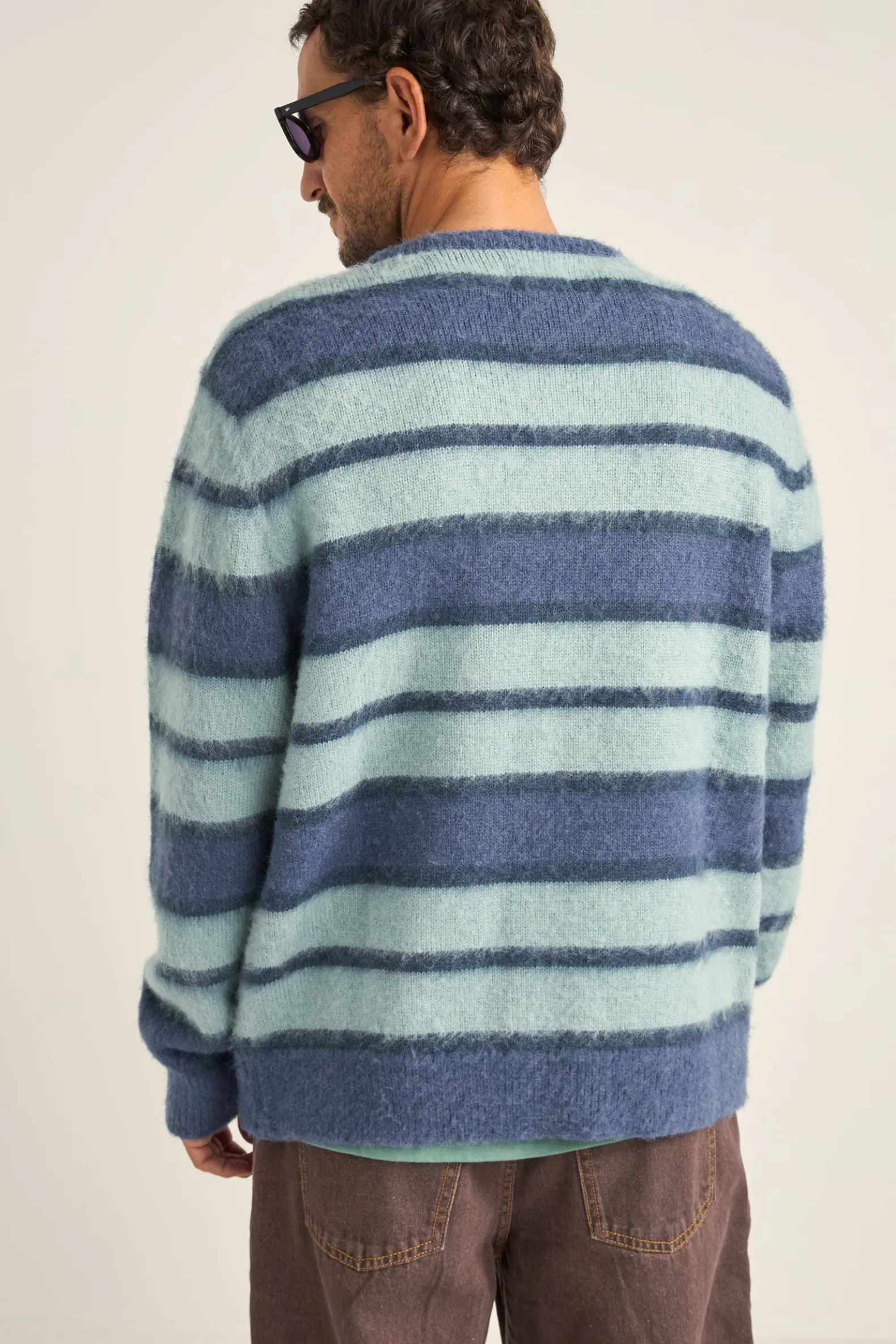 Elevate your coastal style with Harvey Mohair Stripe Knit in Blue. This regular fit, fluffy cotton knit features brushed knit detail, a classic crew neck, and signature Rhythm trims for a blend of comfort and timeless design.