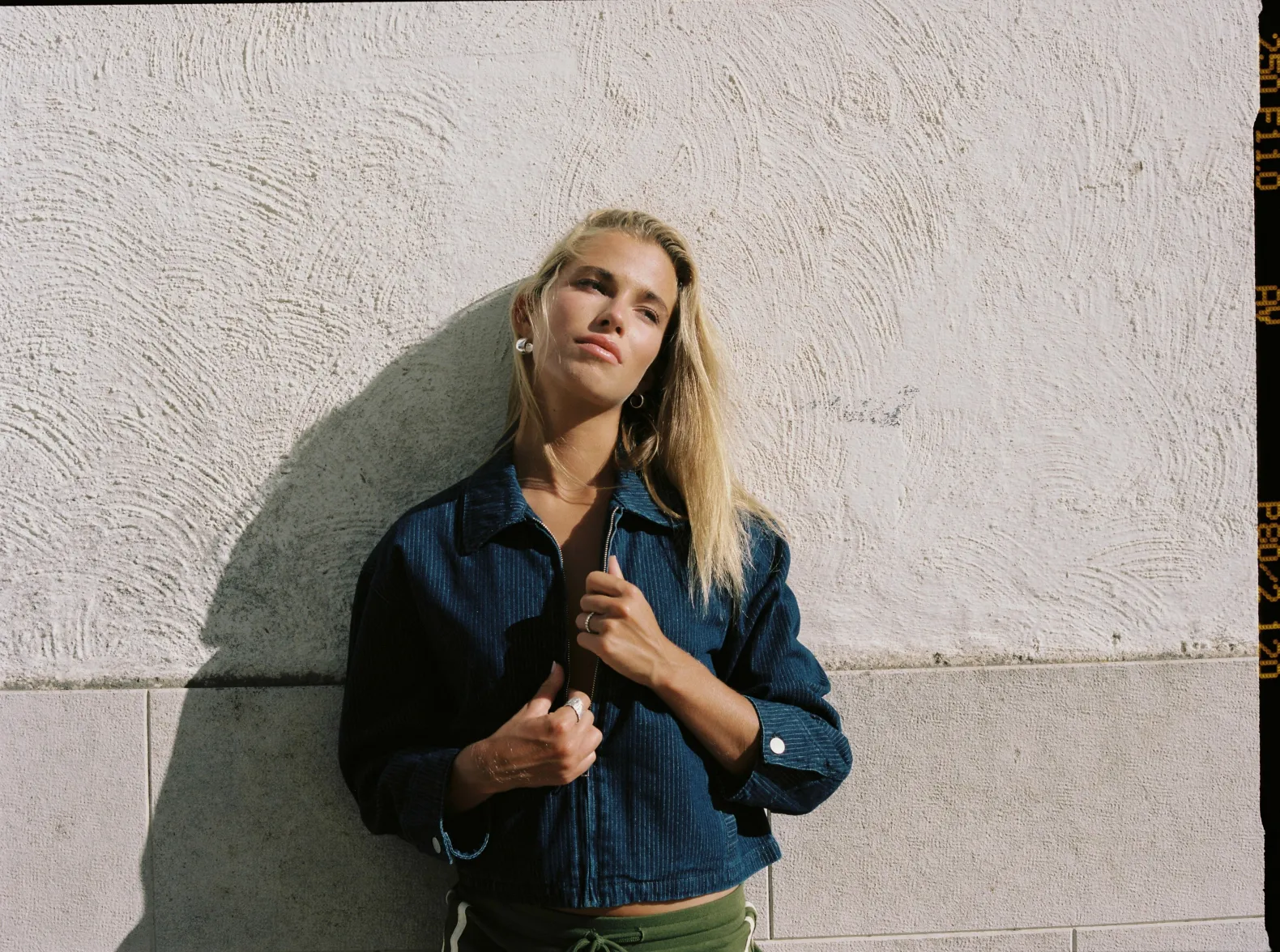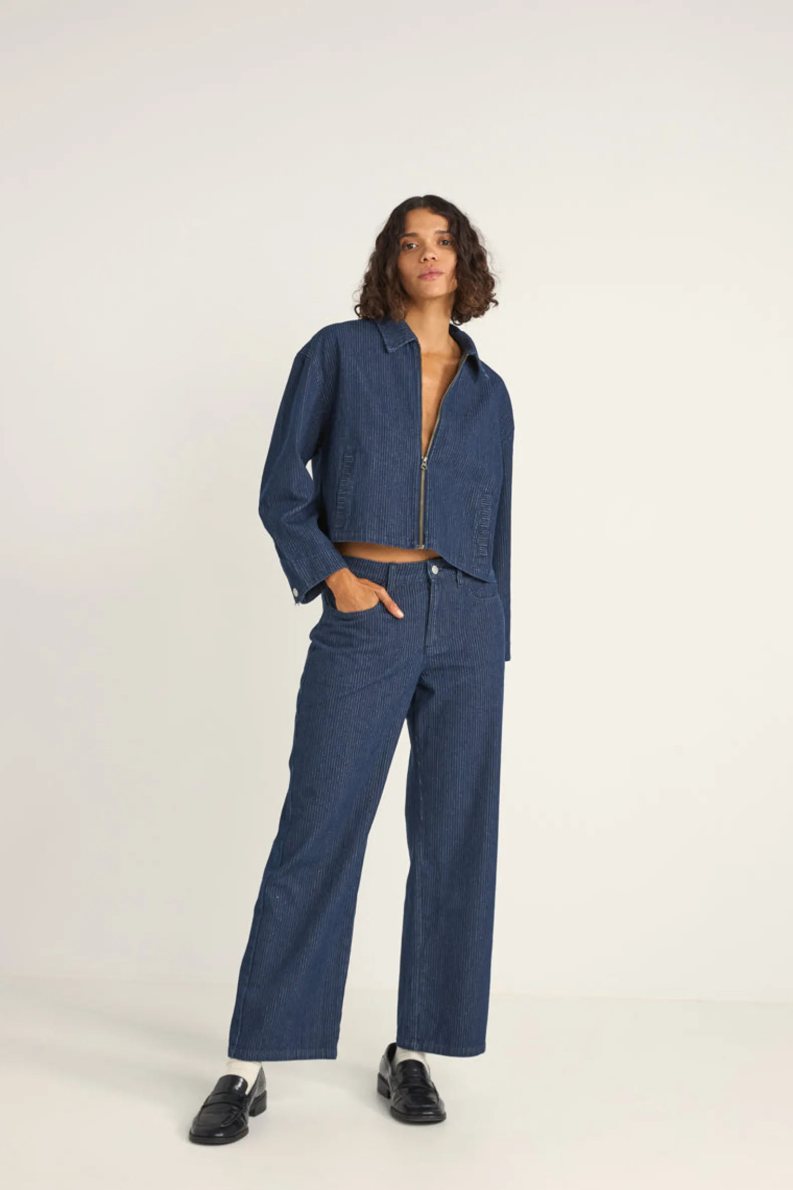 The Pinstripe Cropped Jacket in indigo adds a fresh twist to your outerwear. Its boxy fit and subtle pinstripes make it a versatile piece for layering.