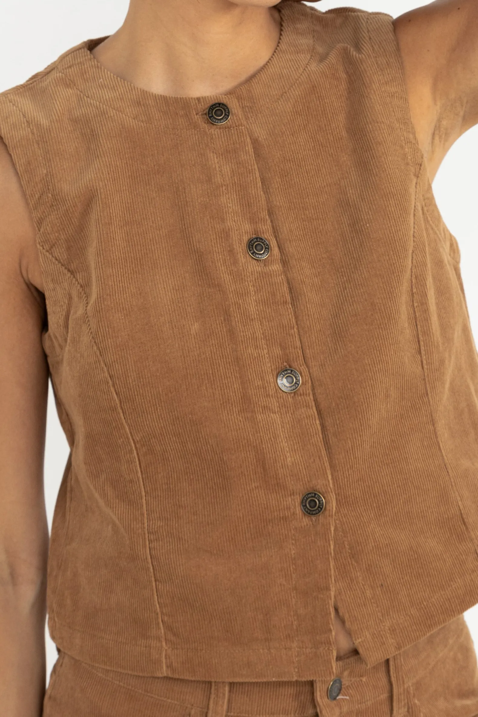 Refined yet relaxed, the Sadie Corduroy Vest in Cedar offers a fitted silhouette with classic metal button closures. Perfect for layering, it blends timeless style with modern versatility for cooler days by the coast.