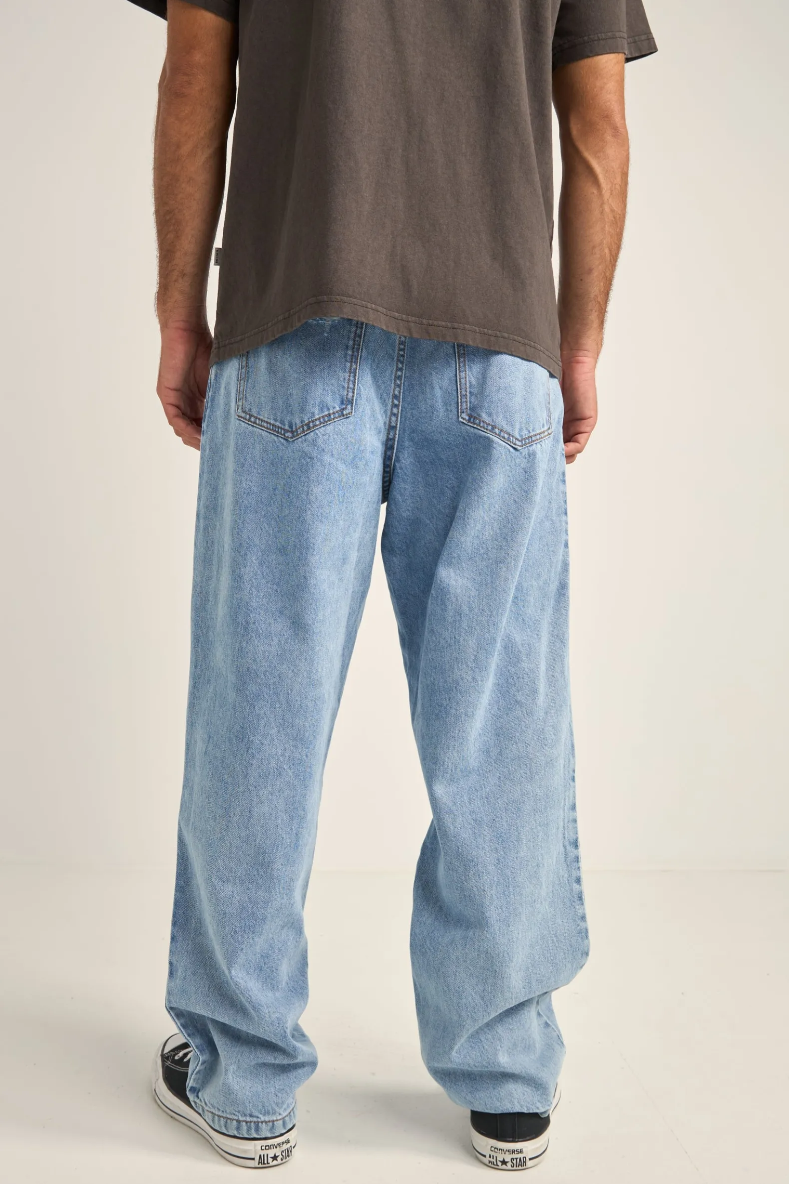 Discover laid-back coastal style with our Subtle Distress Jeans in Blue. These wide loose-fit pants feature a 41-inch outseam, light blue colorway with a light wash, metal button and fly closure, subtle distressing details, and signature Rhythm trims. Perfect for relaxed, everyday wear.