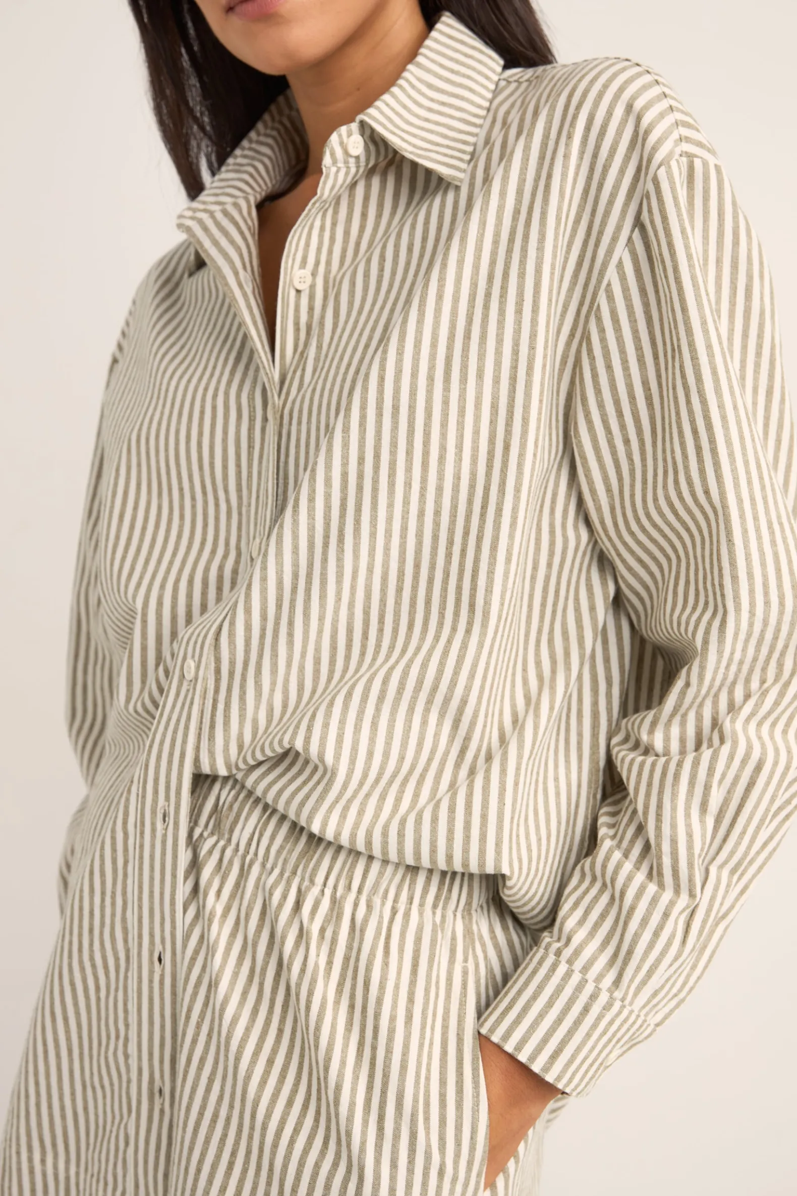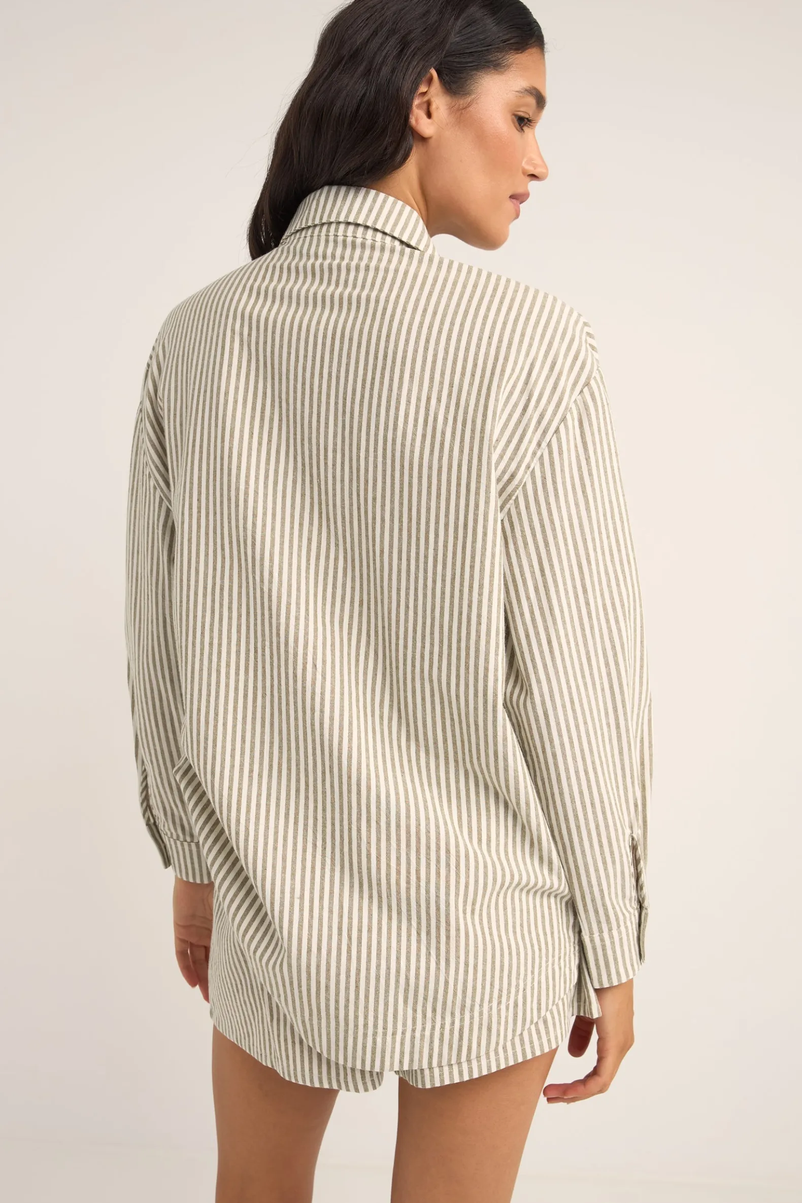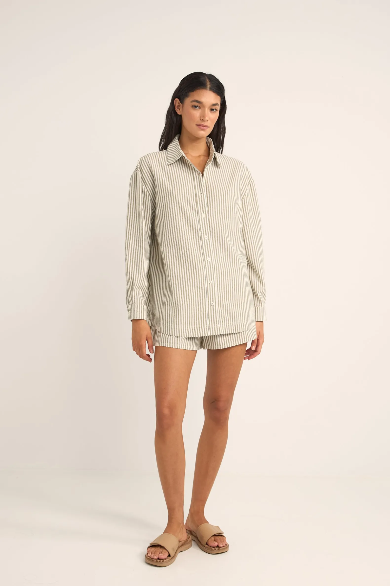 The Ivy Valley Stripe Oversized Shirt weaves the lush landscapes of the coast into its fabric. Made from 100% cotton, this airy, oversized button shirt comes with a scooped front and back hem shape, making it an ideal choice for those leisurely beachside days or as a chic cover-up.