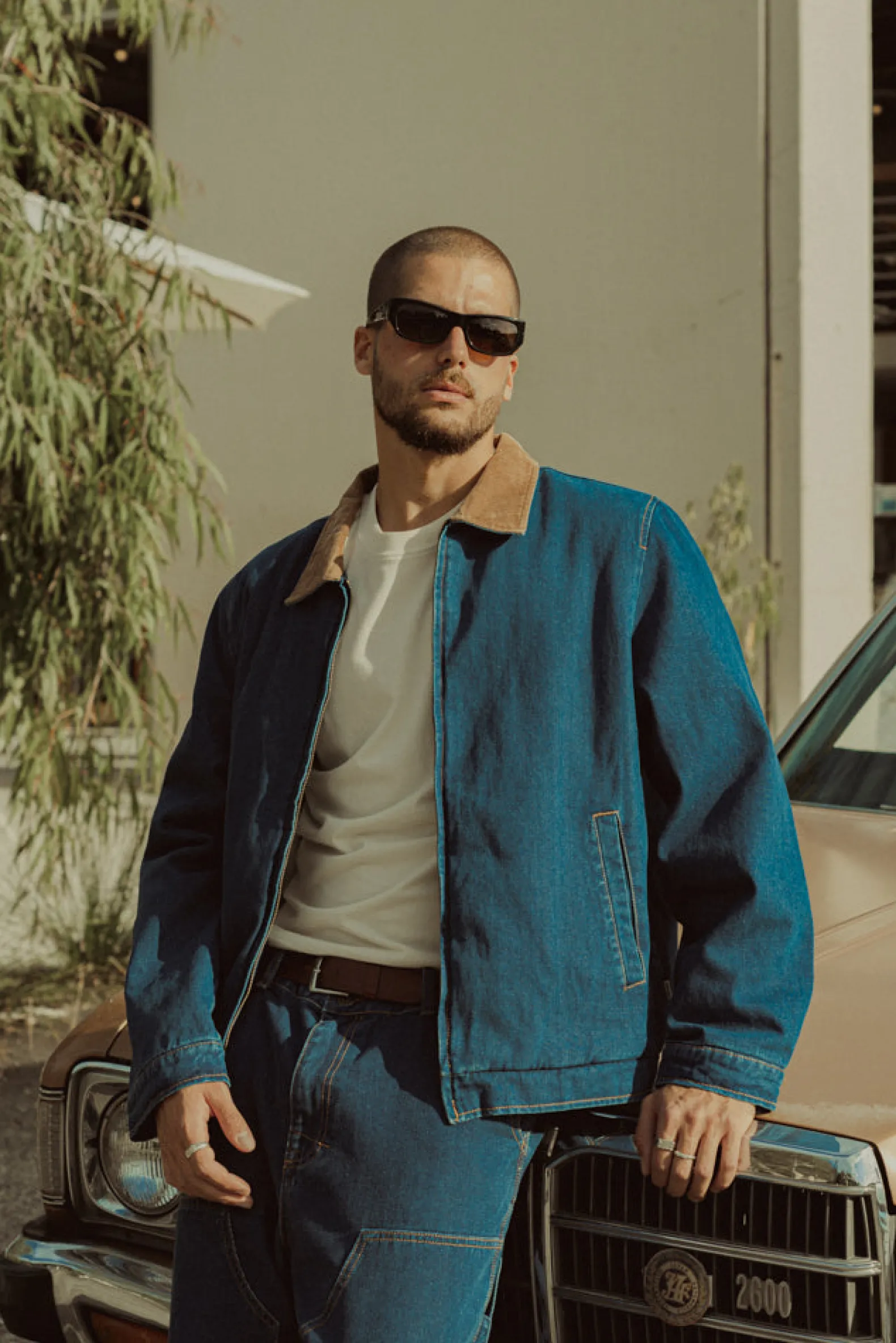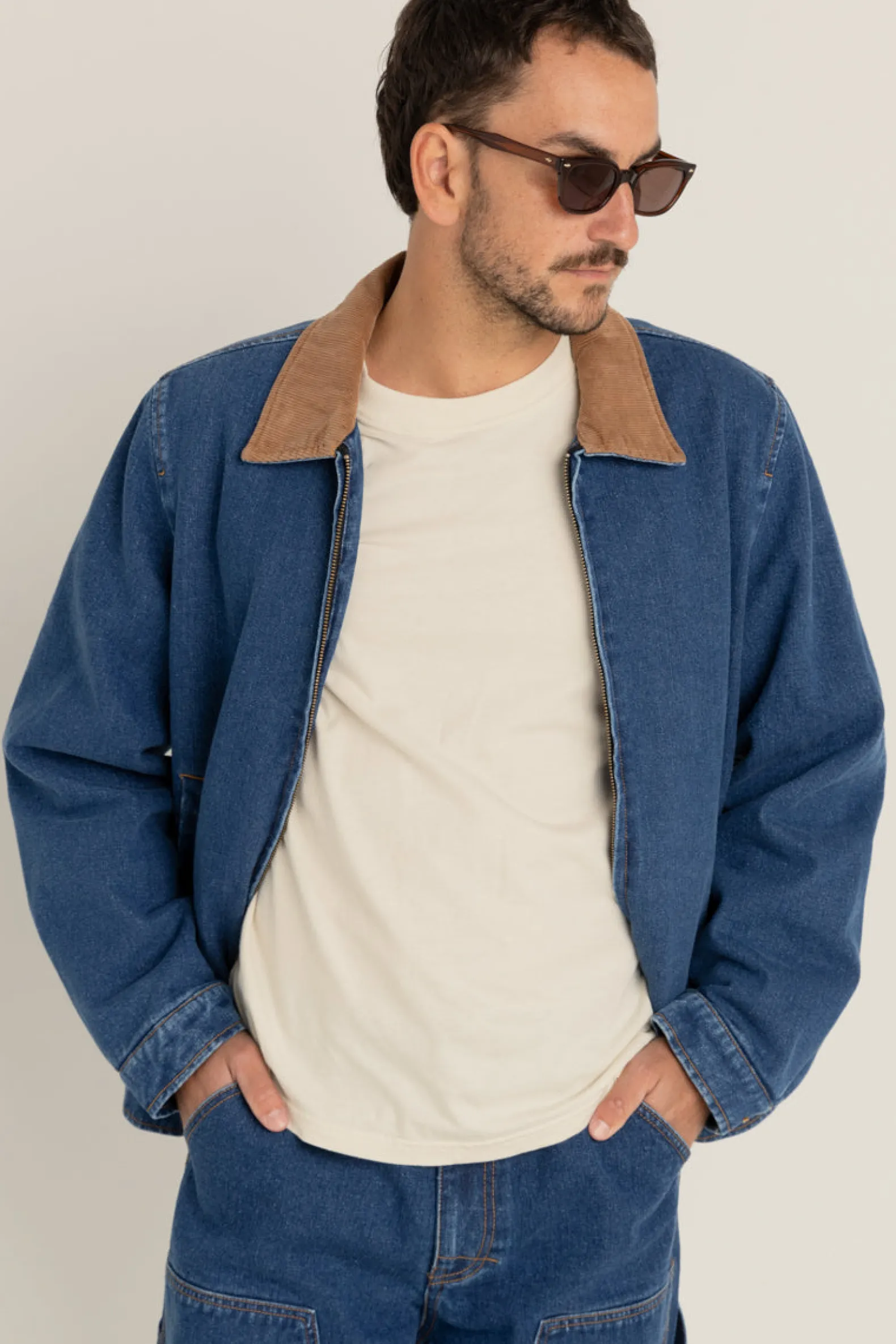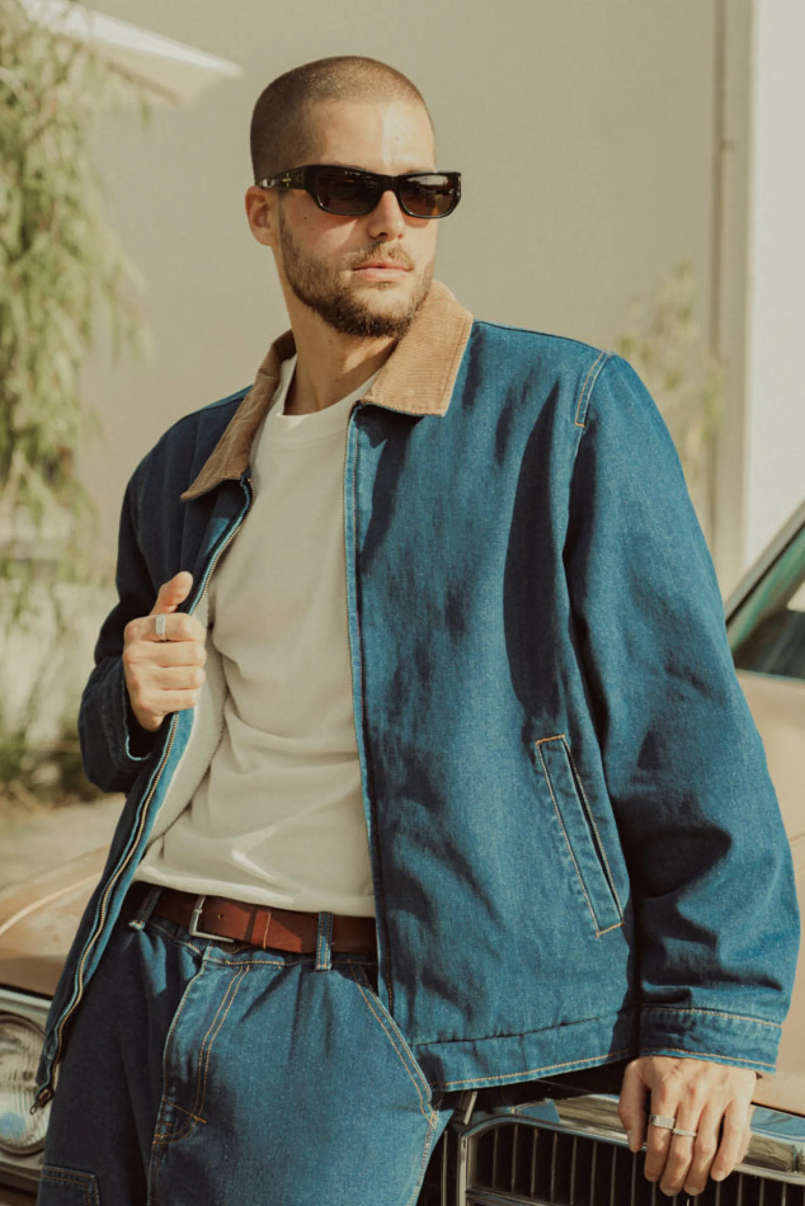 A heavy-weight washed denim jacket with a contrast cord collar, branded trims, and a button-down front. Vintage-inspired for effortless coastal layering.