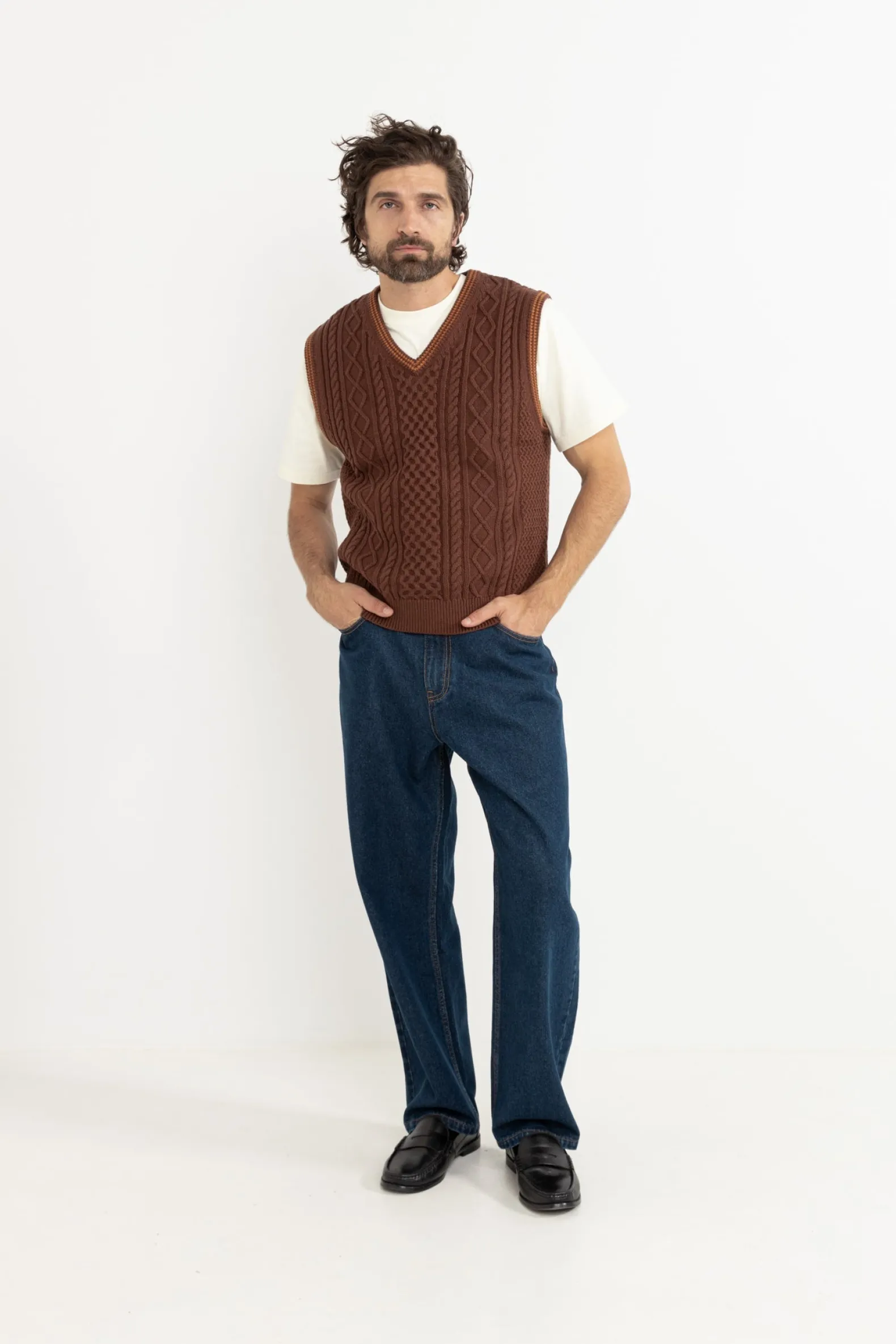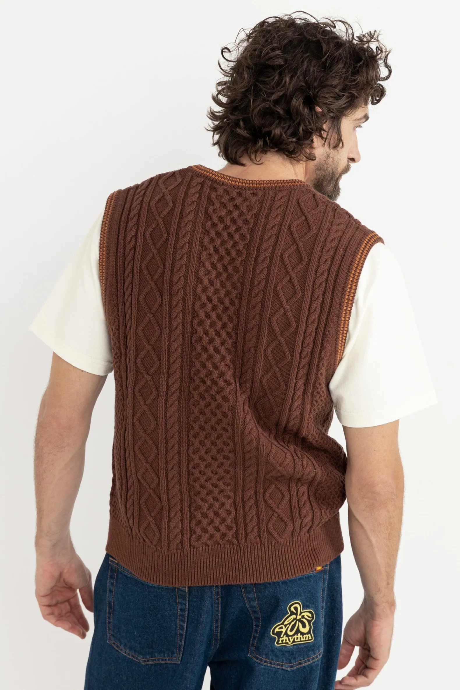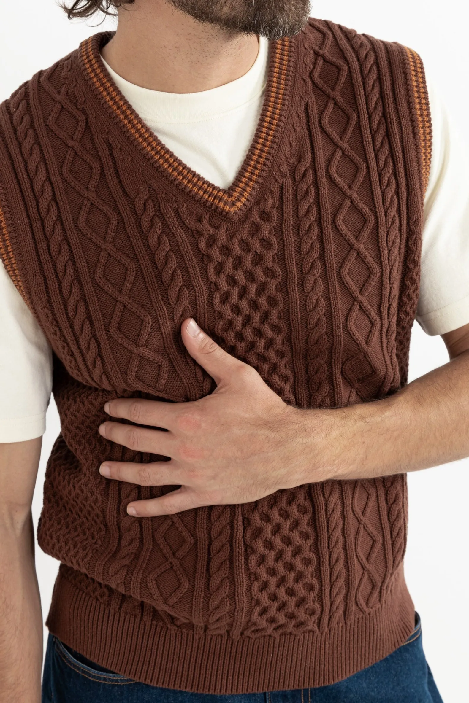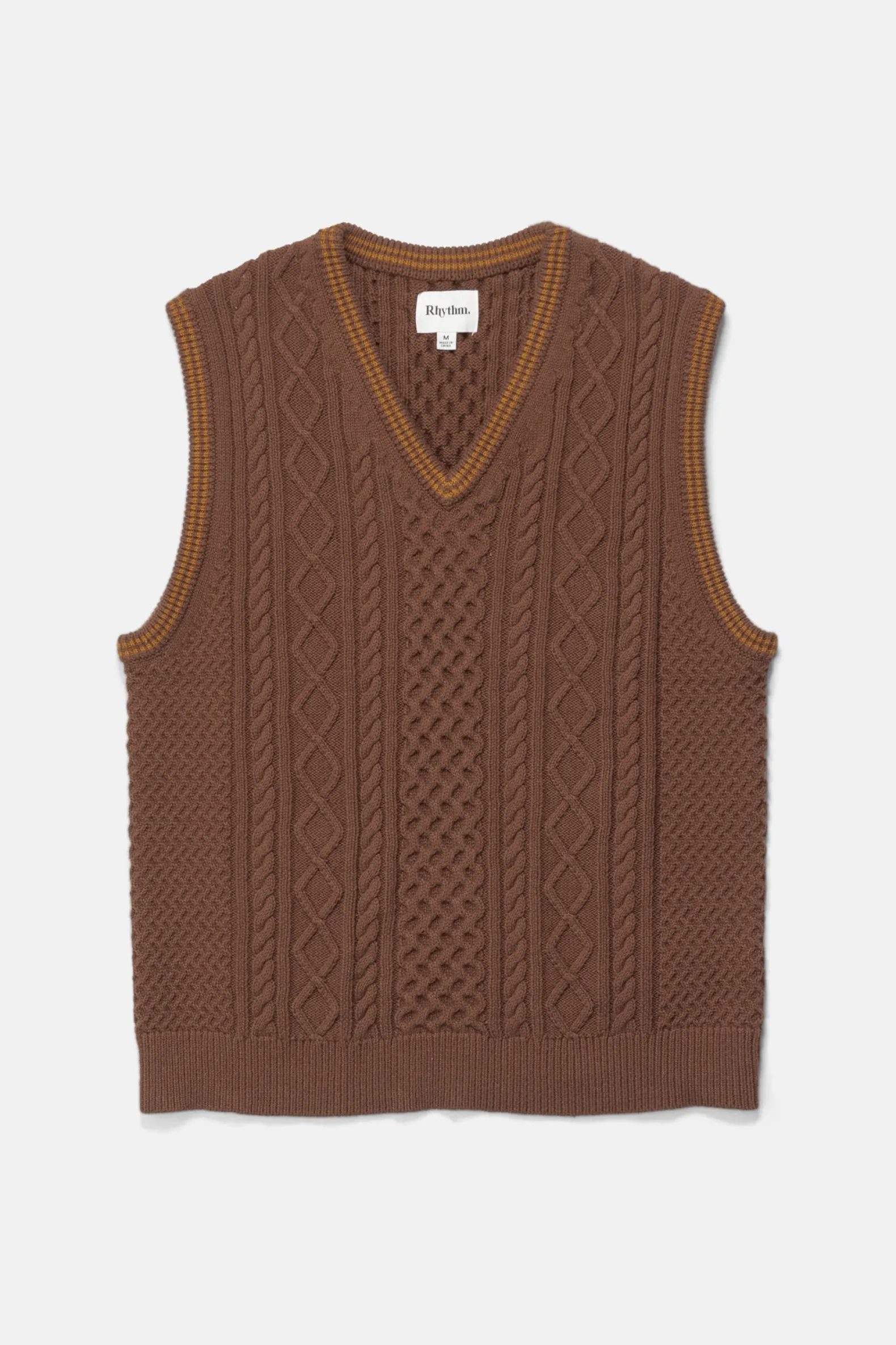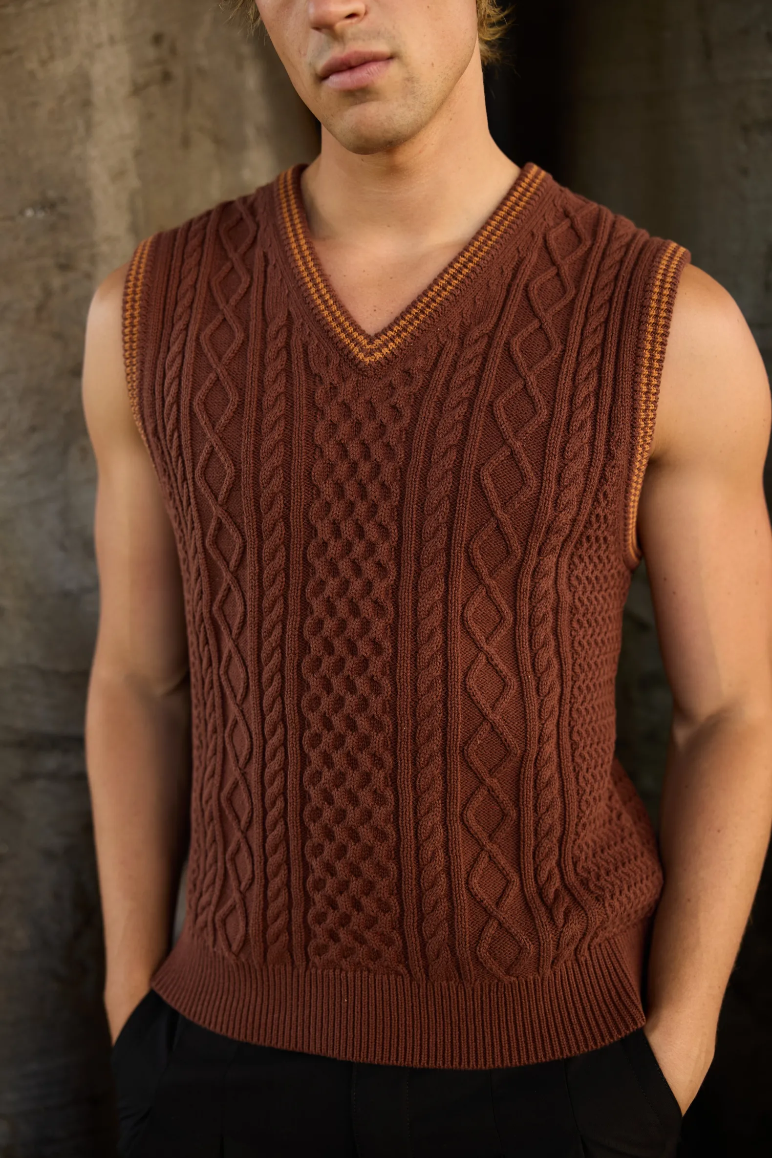 A classic with a modern twist, the Assembly Fisherman Knit Vest in Brown is accented with orange contrast stripes at the armholes and neckline. Its soft knit texture ensures both comfort and style.