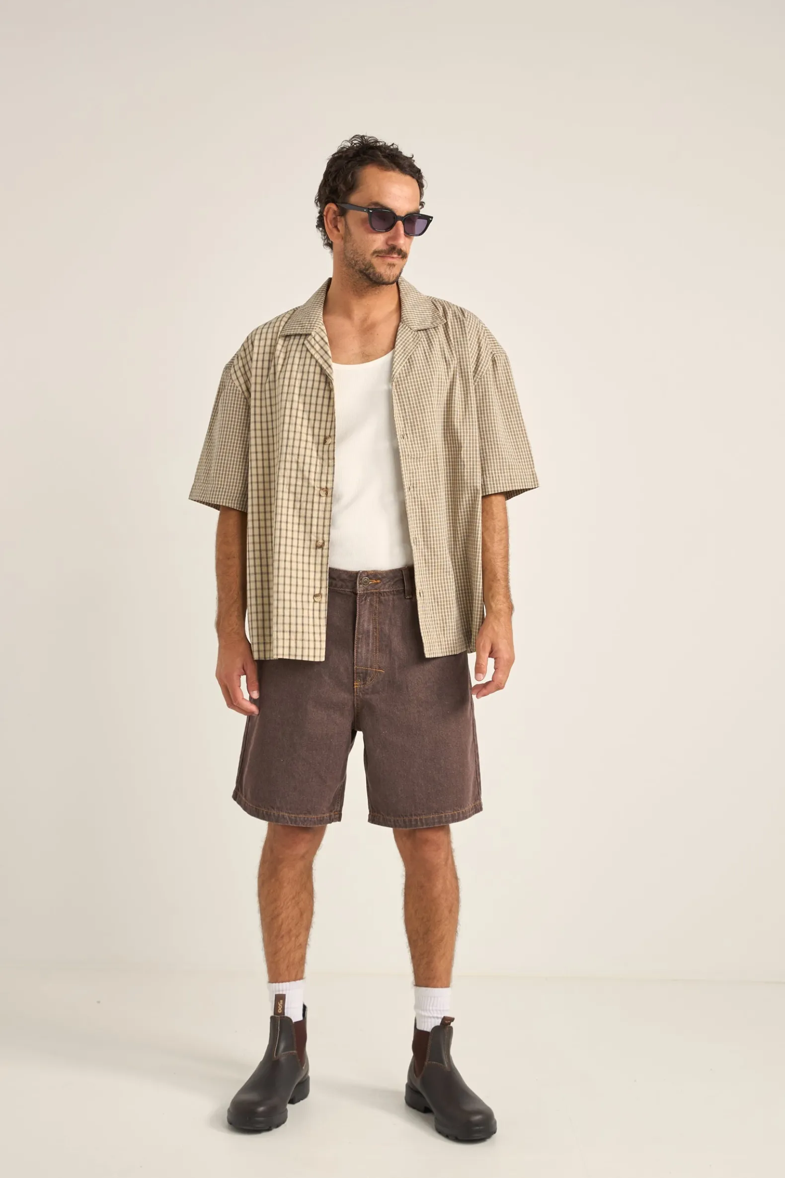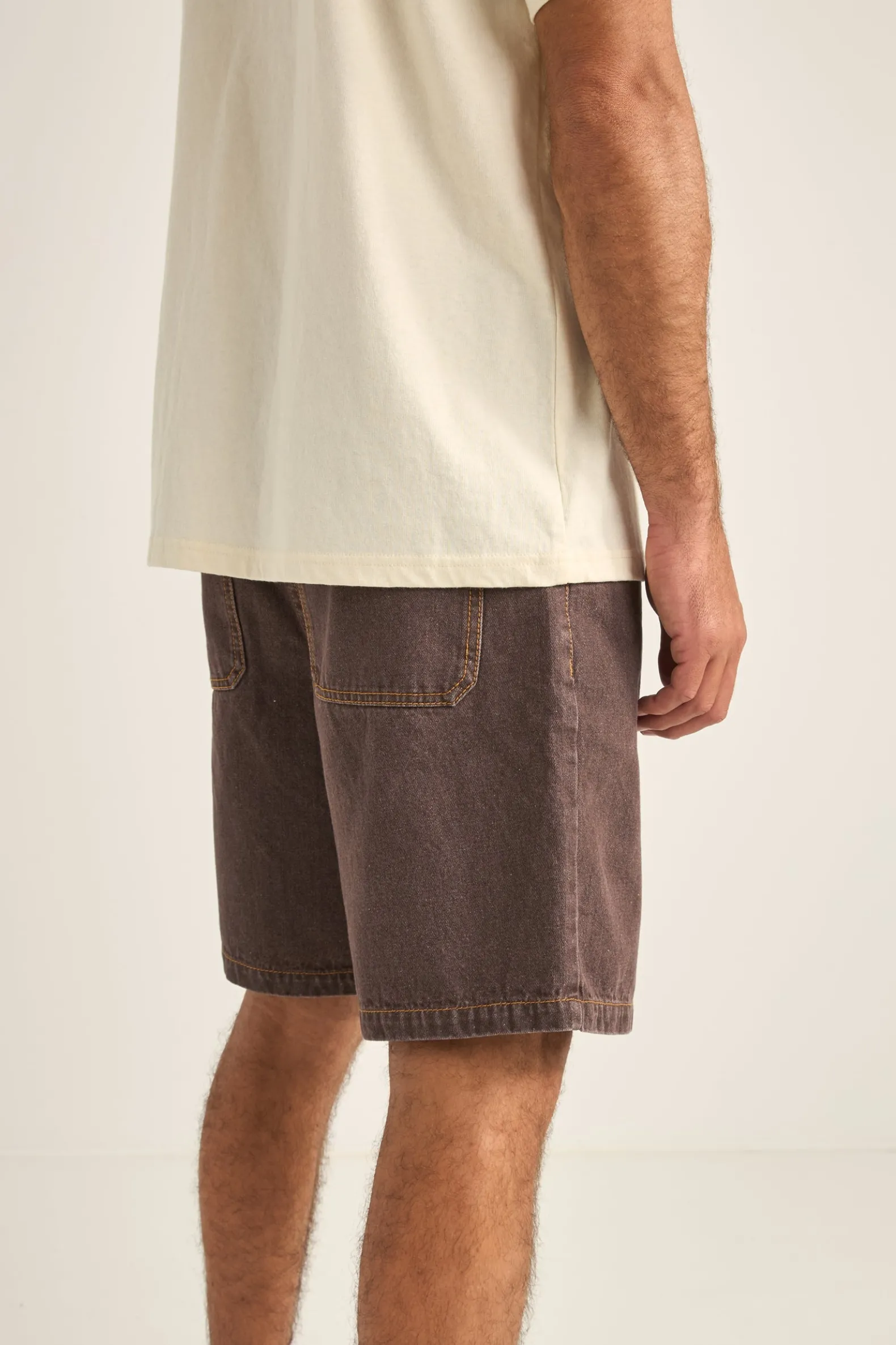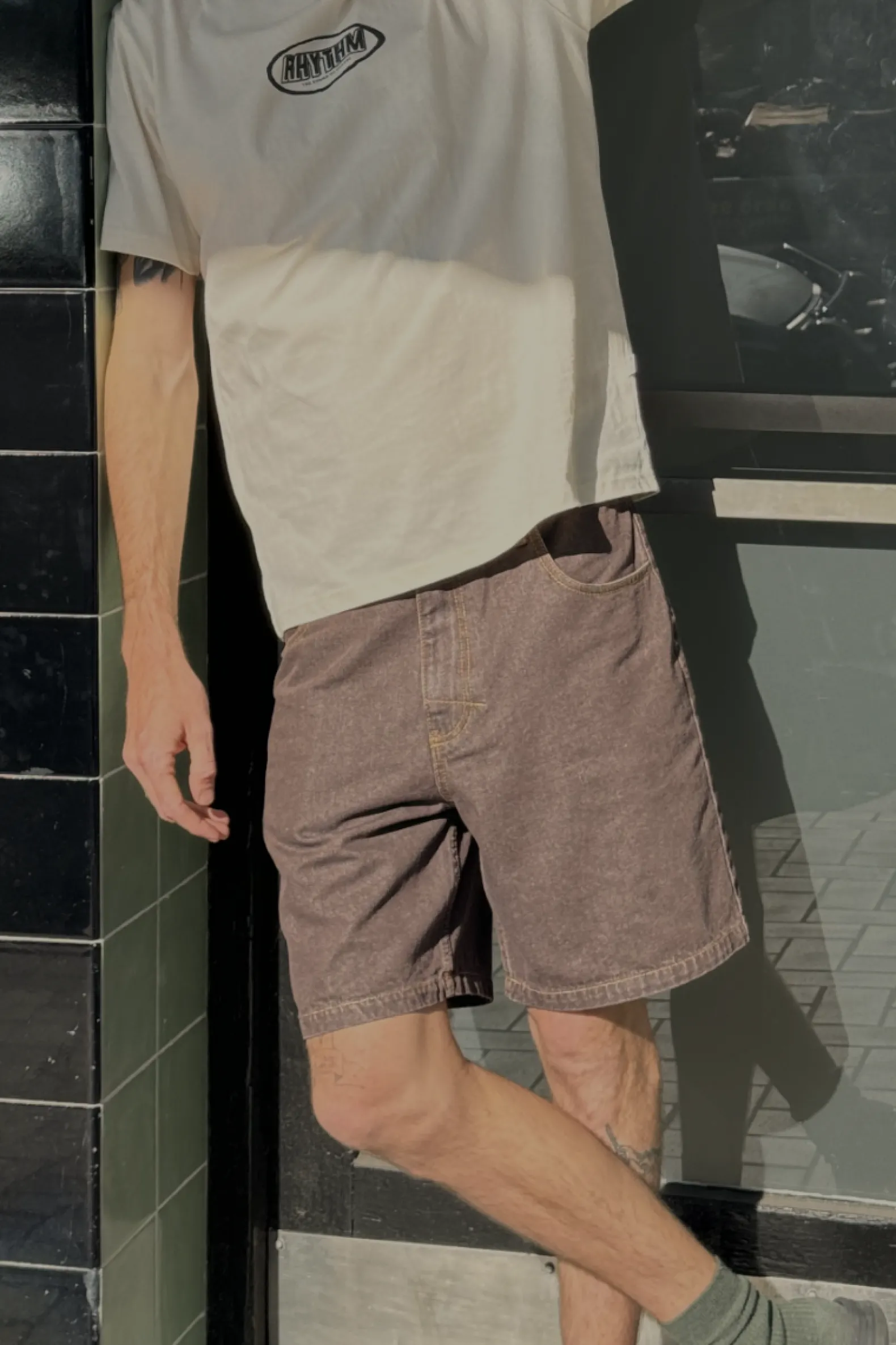 Upgrade your summer style with the Chile Denim Short in Brown. These 19-inch washed denim shorts feature brushed gold detailing, offering a perfect blend of rugged durability and coastal charm for any adventure.