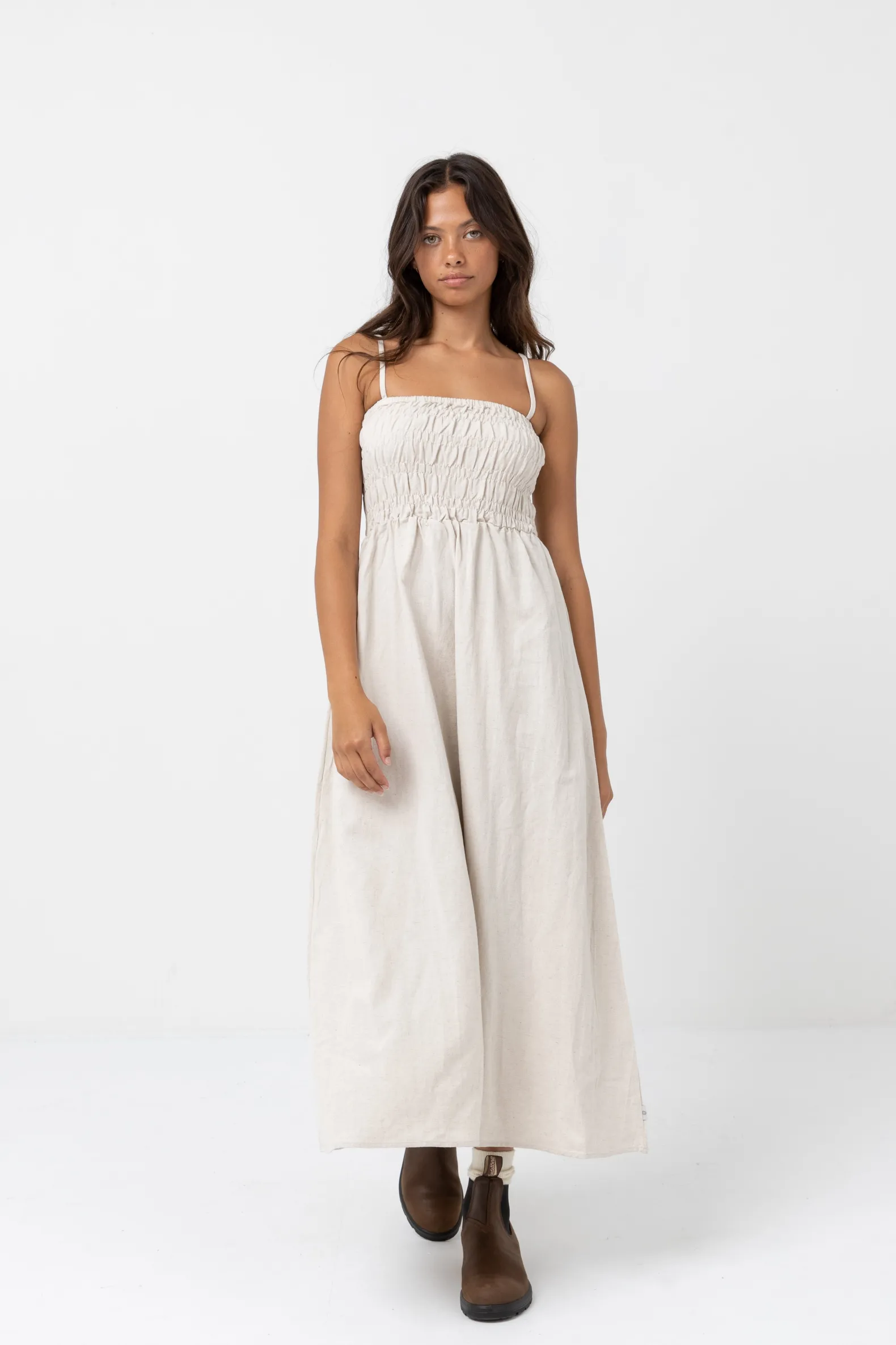 Made for breezy summer days and effortless everyday wearing, the Classic Shirred Midi Dress features a smocked front and back bodice, straight neckline and adjustable straps a season essential.