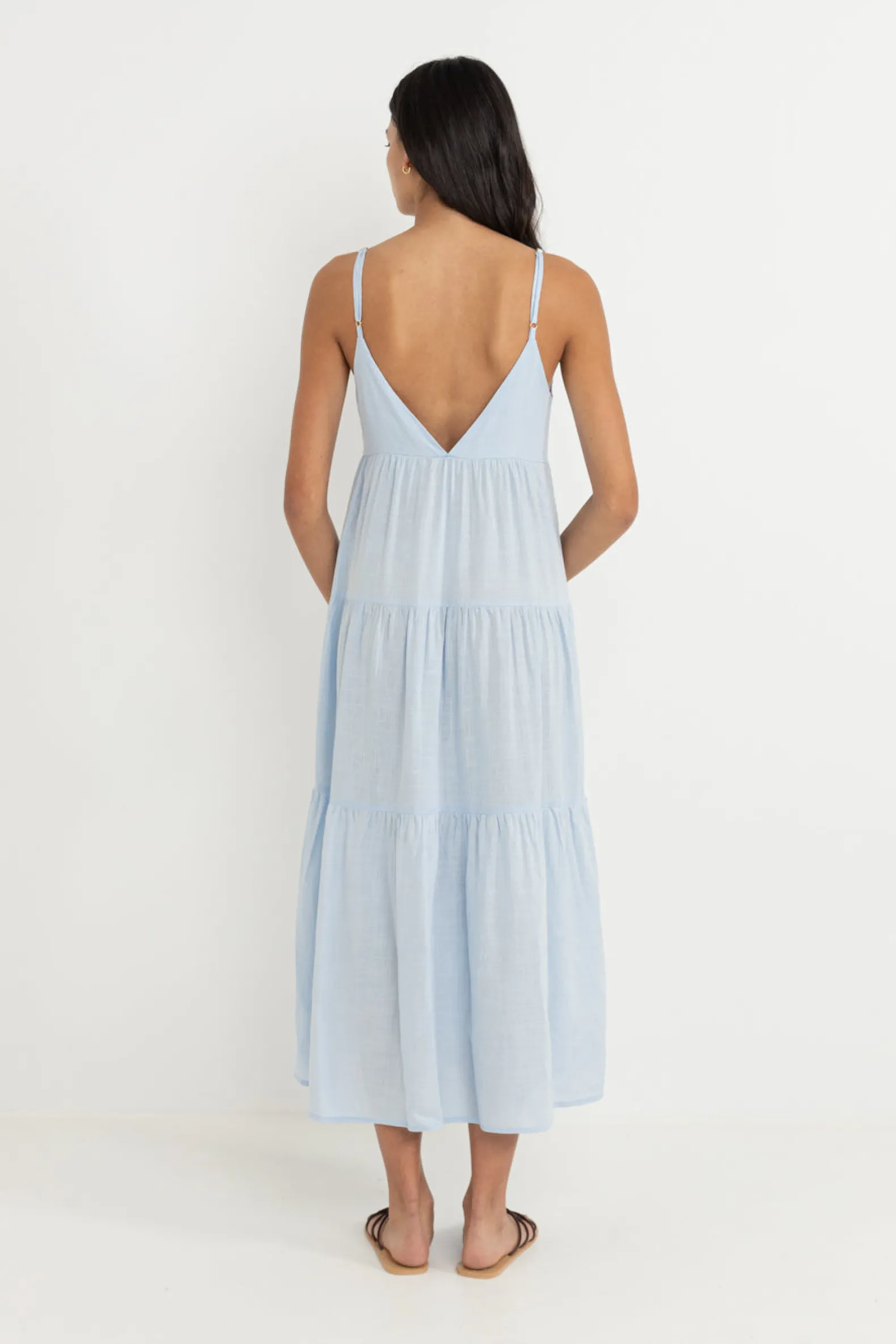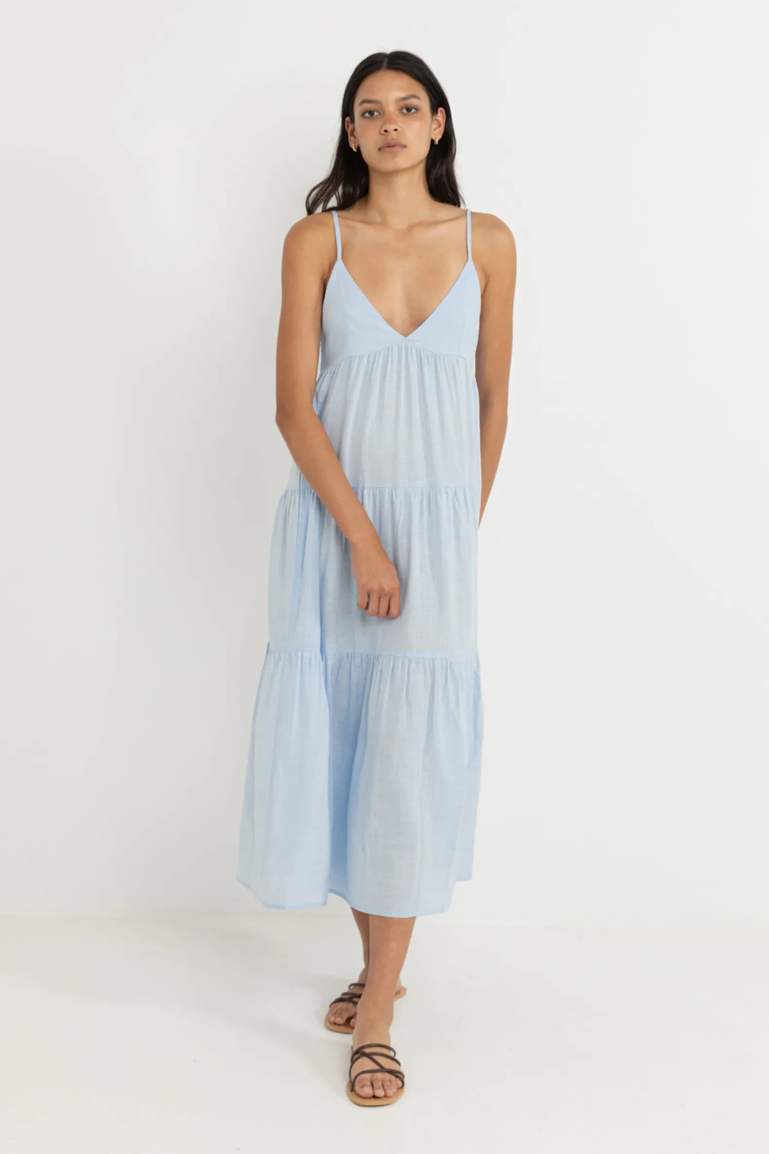 With a fitted bodice, deep V neckline and full sweeping hemline, the Classic Tiered Midi Dress is sure to make a statement. Delivering an elegant coastal design that can be worn between dinner dates, and beach walks both.