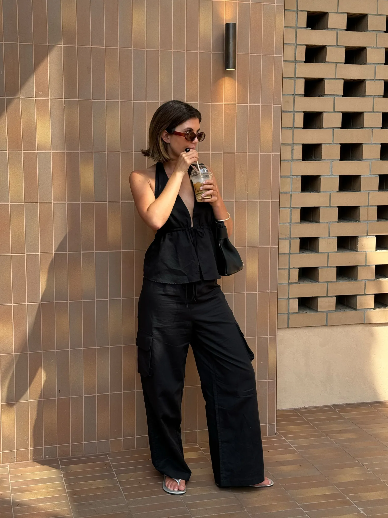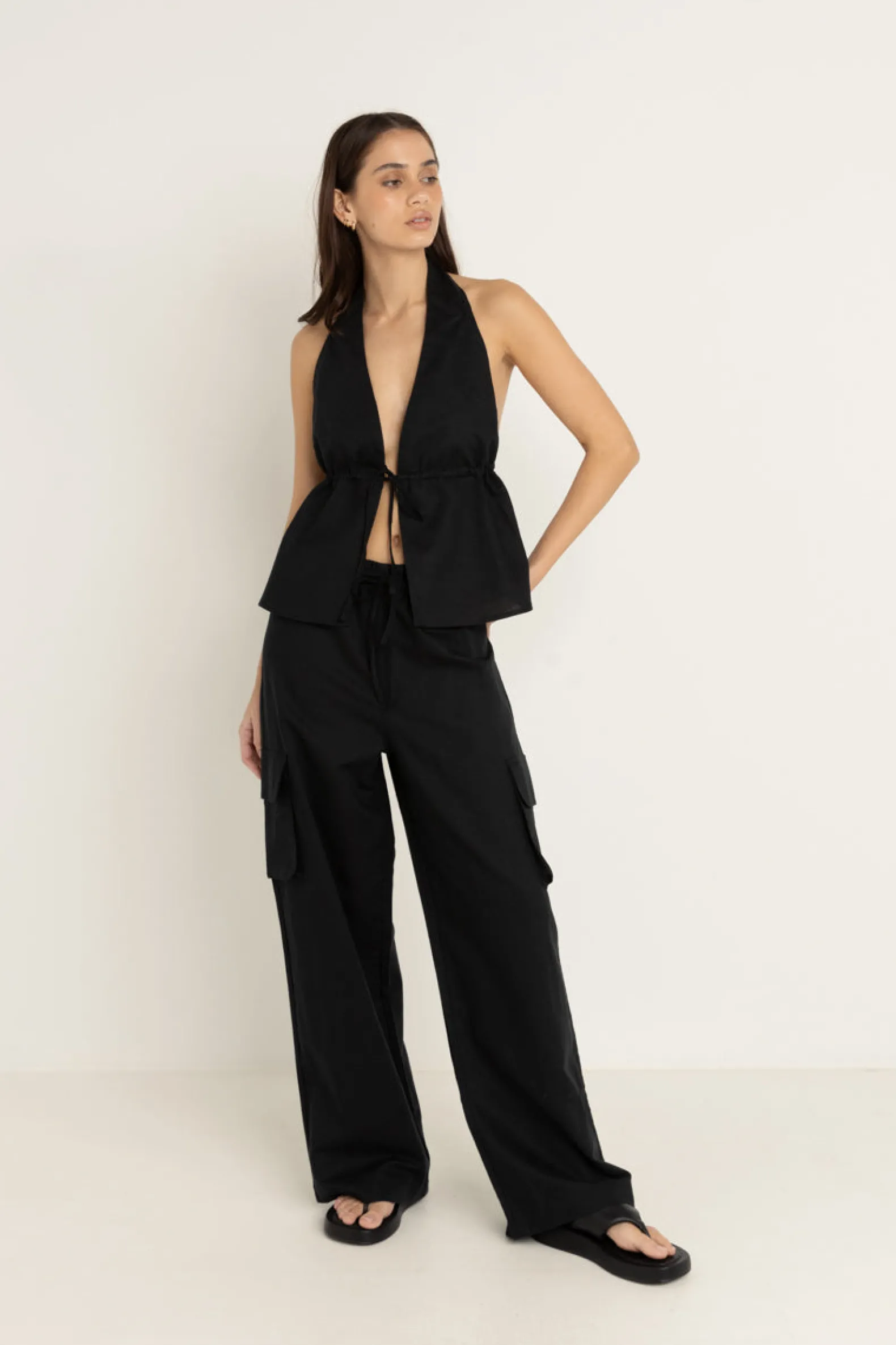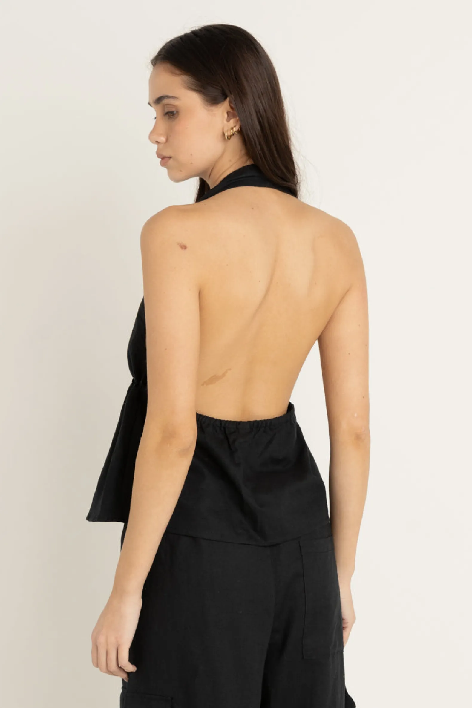 The Cove Halter Top in Black combines flirty and refined with its ruffle detail and spaghetti CF tie. A versatile piece for both casual and chic looks.