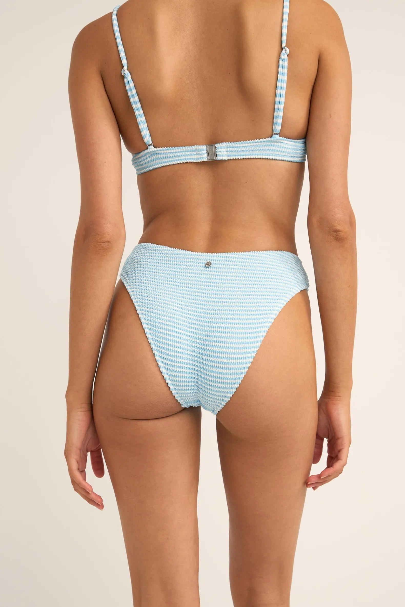 Enjoy the versatility of the Cove Stripe Holiday Pant, offering moderate coverage with a mid-rise waist. Made from recycled polyester and polyamide, this pant provides comfort and coverage without compromising on style. Its clean finished edges and zig zag stitching detail are perfect for those who value sustainability and design.