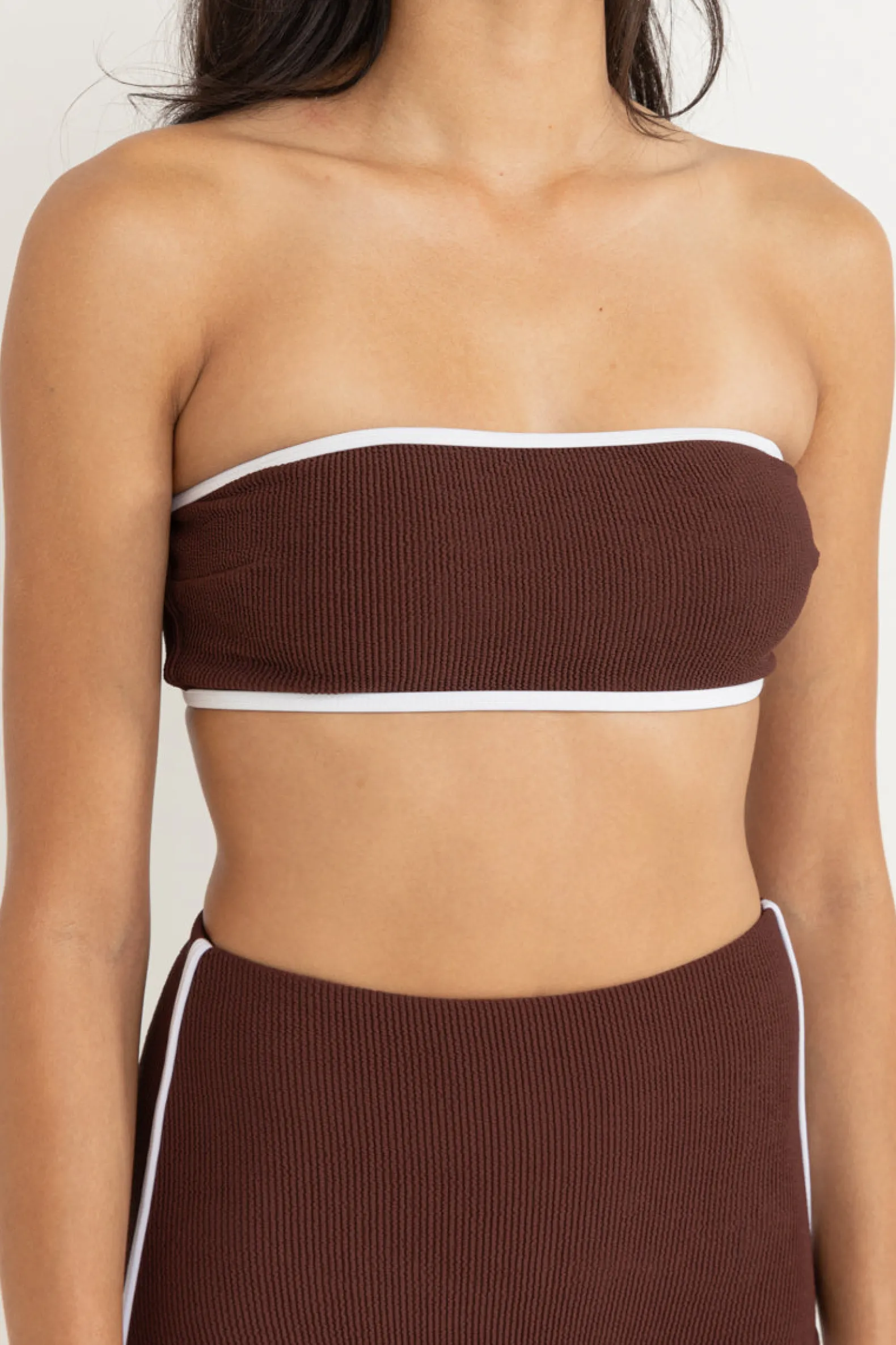 This café bandeau is ideal for A-D cup sizes with pull-on style, removable straps, and white contrast binding. Finished with a Rhythm metal coin logo for effortless beach chic.