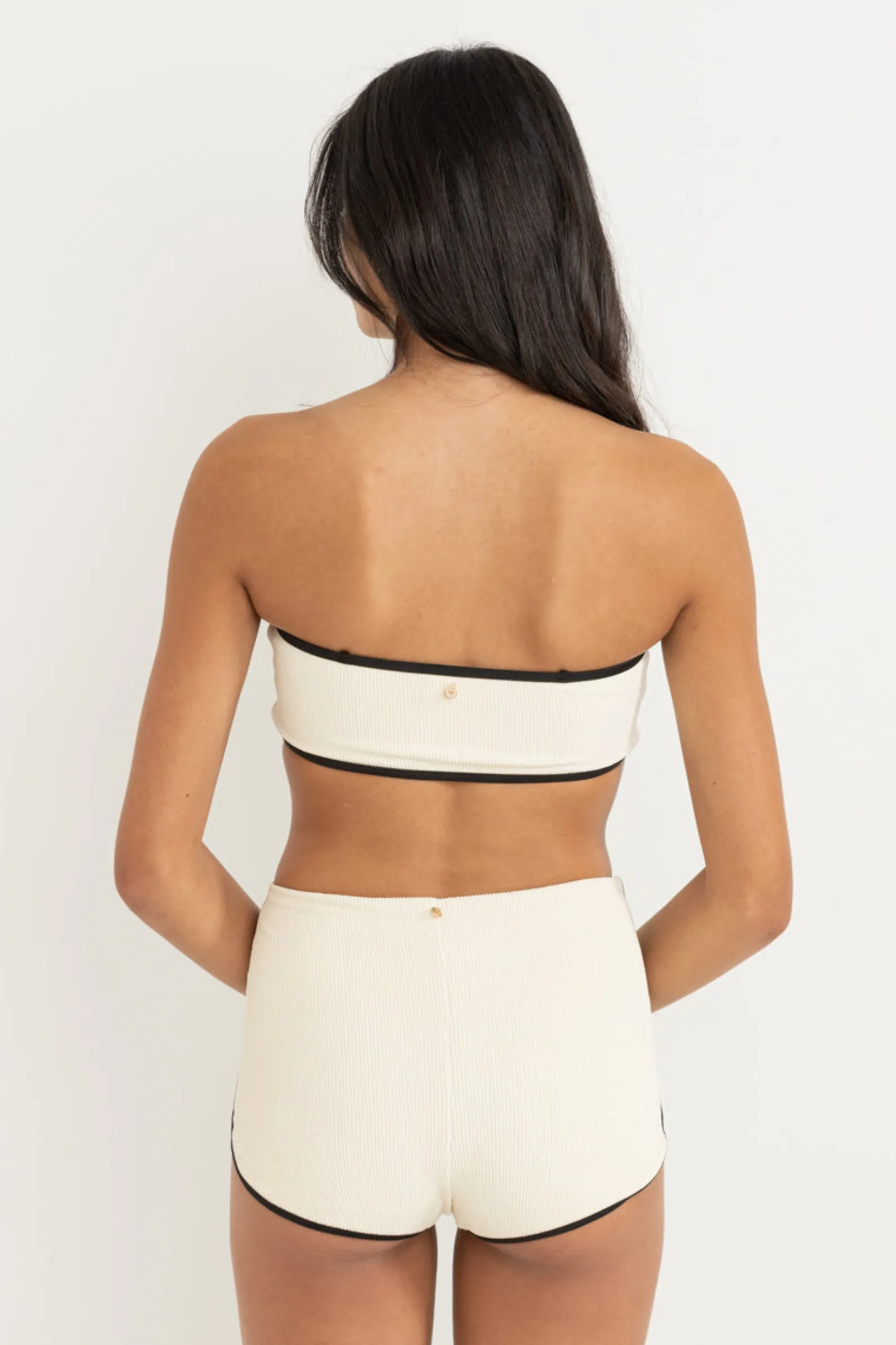 The crème bandeau top features a pull-on style and adjustable straps, offering versatility for A-D cup sizes. White contrast binding and the Rhythm metal coin logo complete the look.