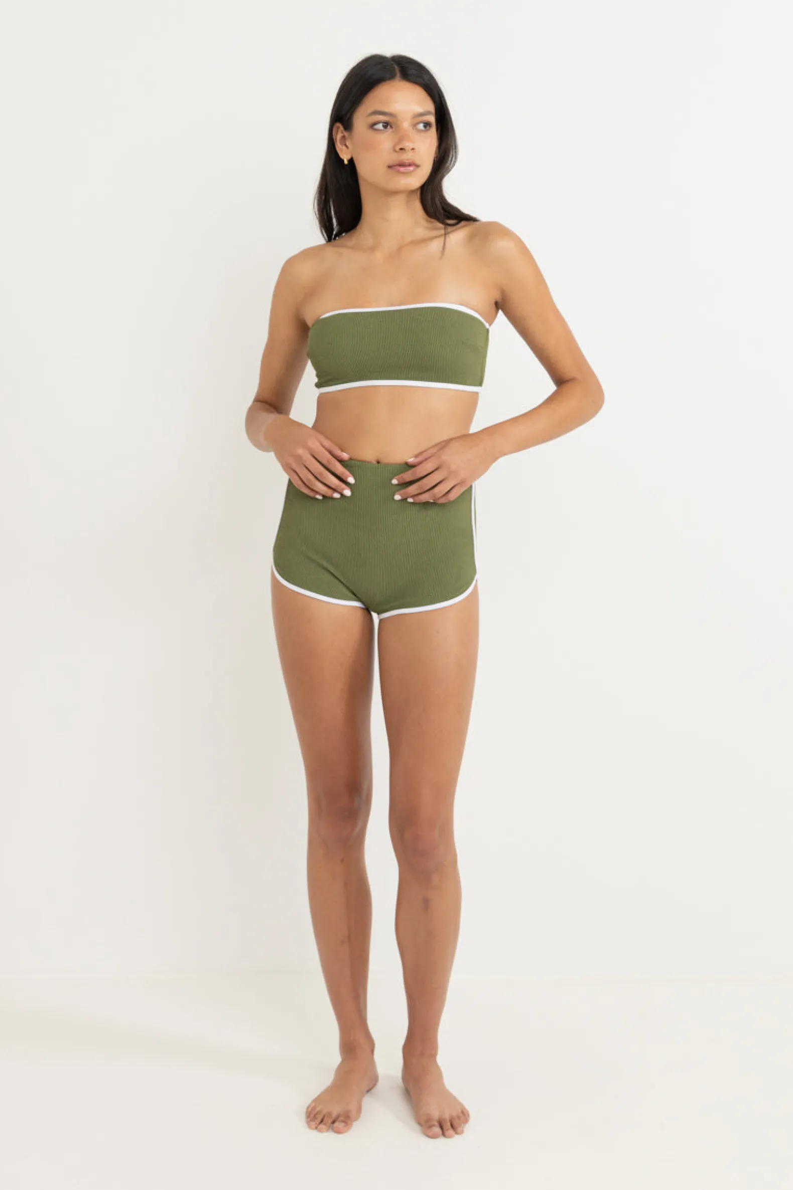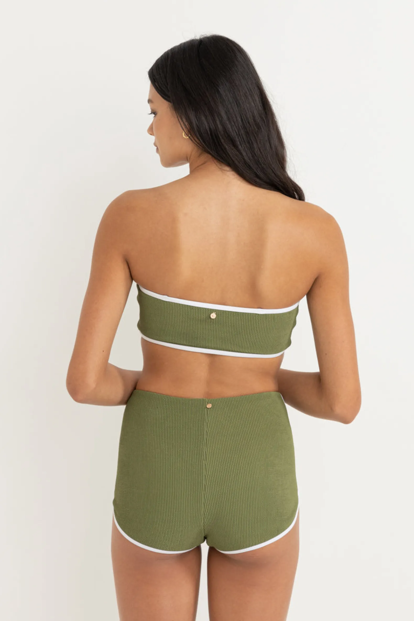 This olive-toned bandeau top, perfect for A-D cup sizes, features a pull-on style and removable straps. White contrast binding and the Rhythm metal coin logo add a coastal touch.