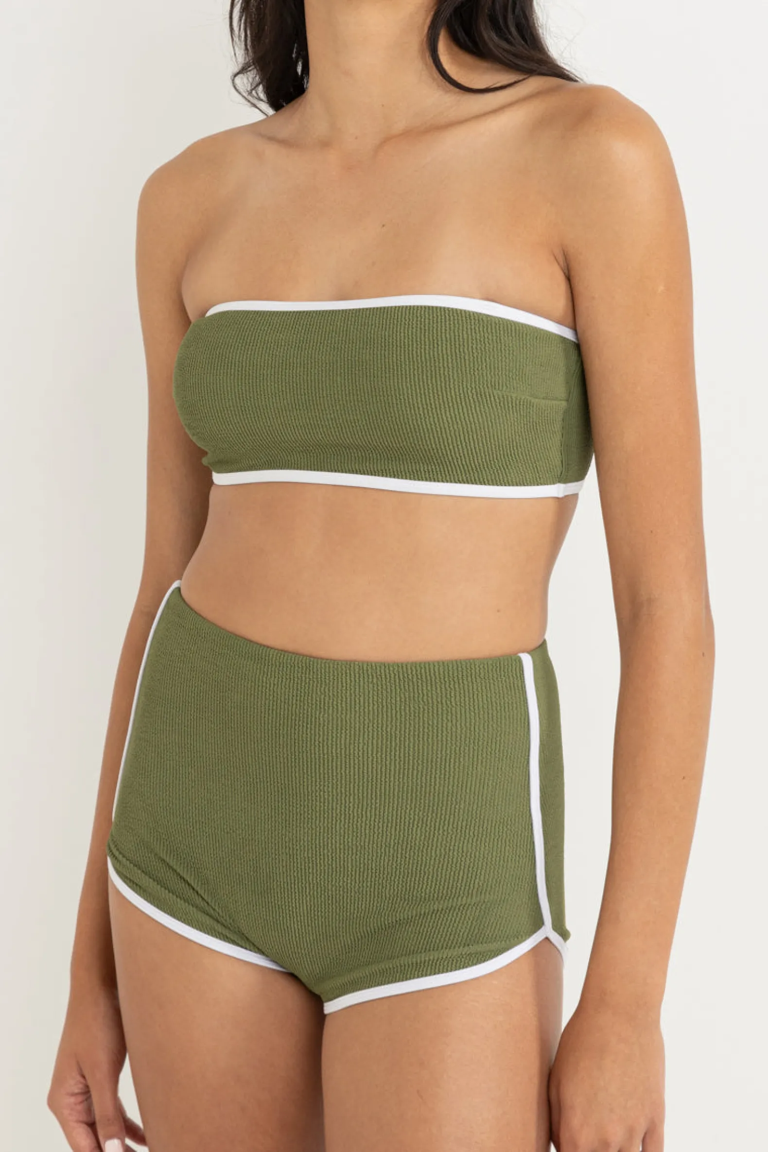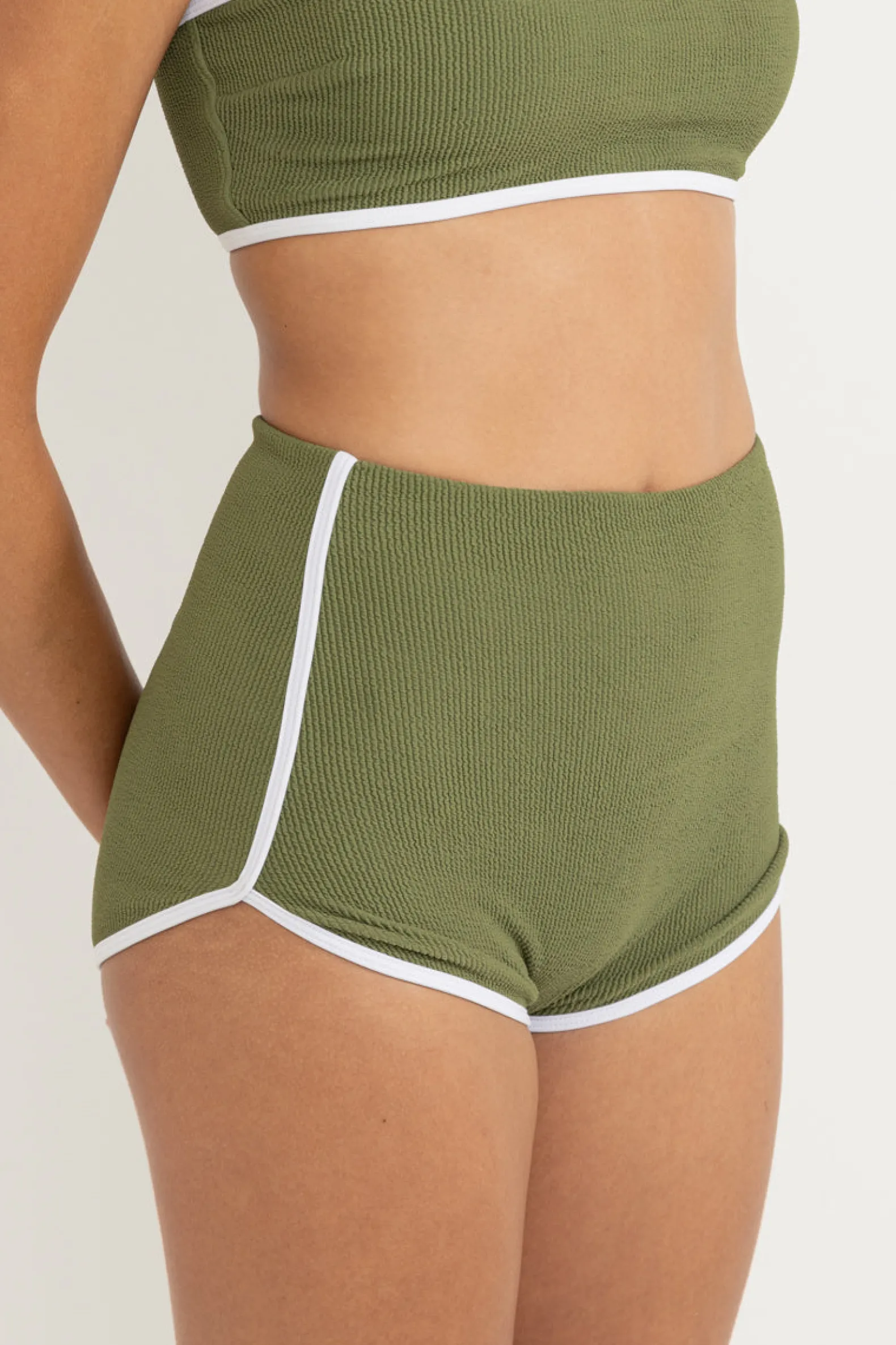 The olive surf short offers full coverage and a high-rise fit, with white contrast binding and the Rhythm metal coin logo for a refined coastal look.