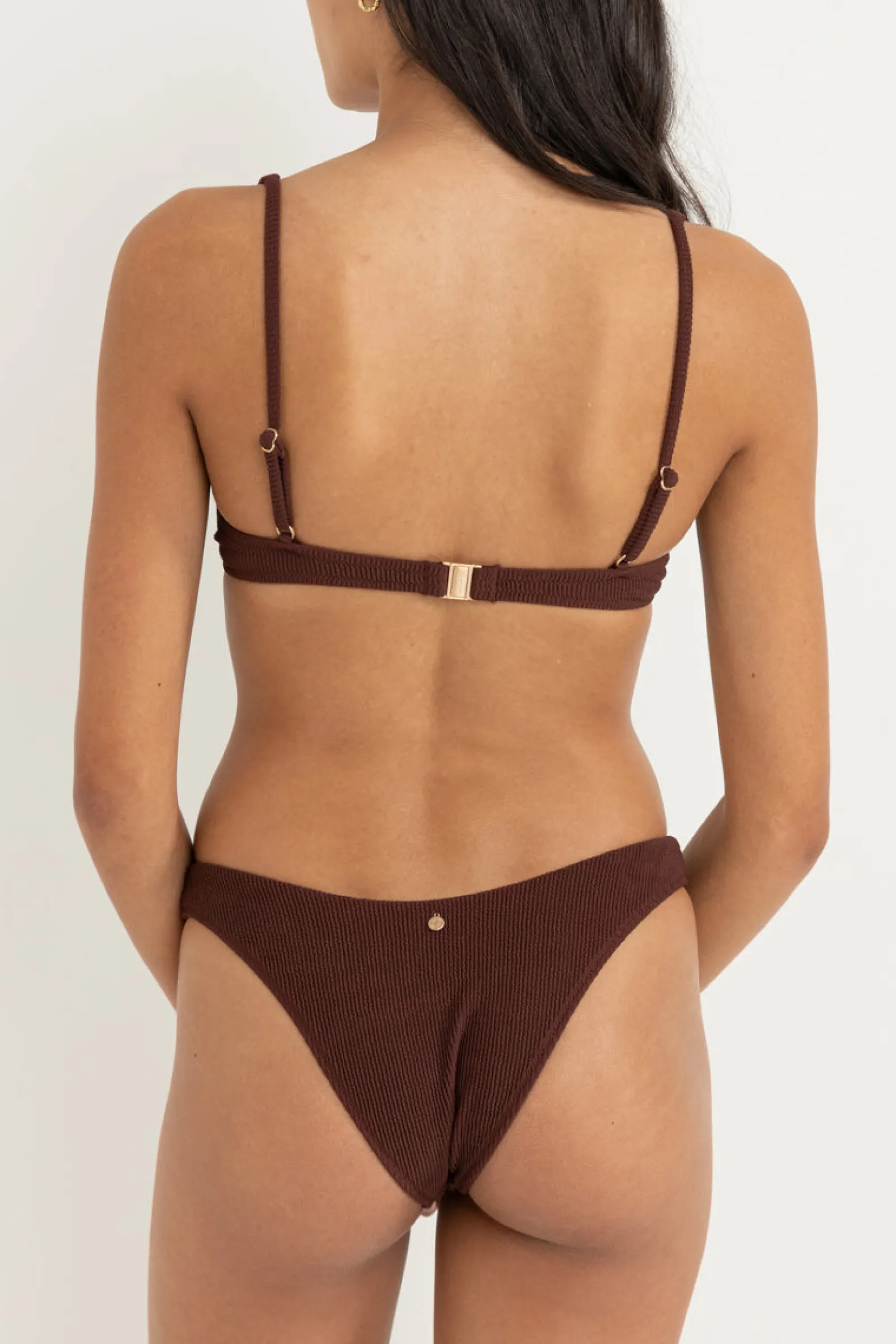 With a high-rise, brief coverage, and black contrast binding, this café pant offers a sleek, minimal look. Finished with a Rhythm metal coin logo.