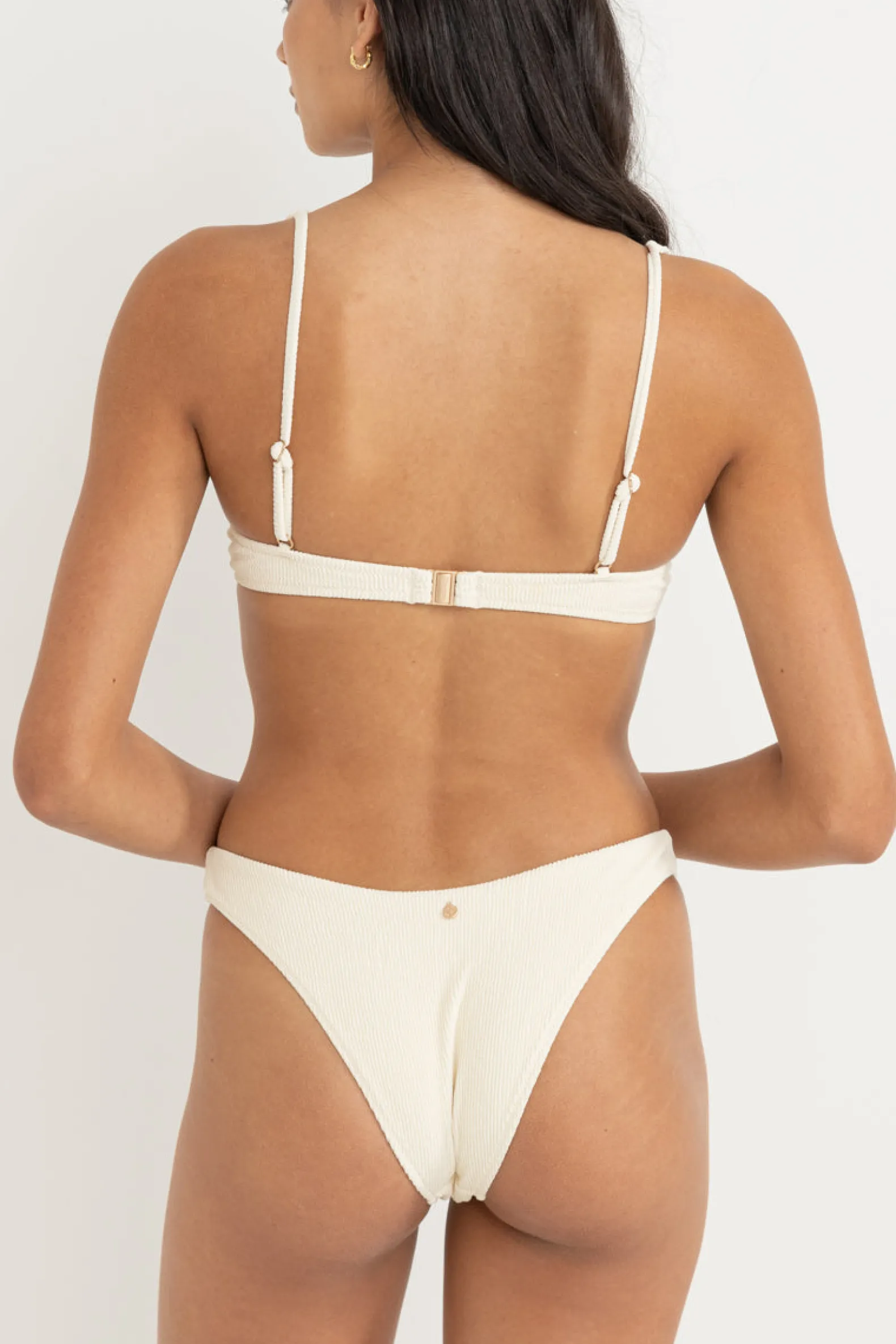 The crème high-cut pant delivers a refined look with white contrast binding and a high-rise fit. Brief coverage and the Rhythm metal coin logo complete the design.