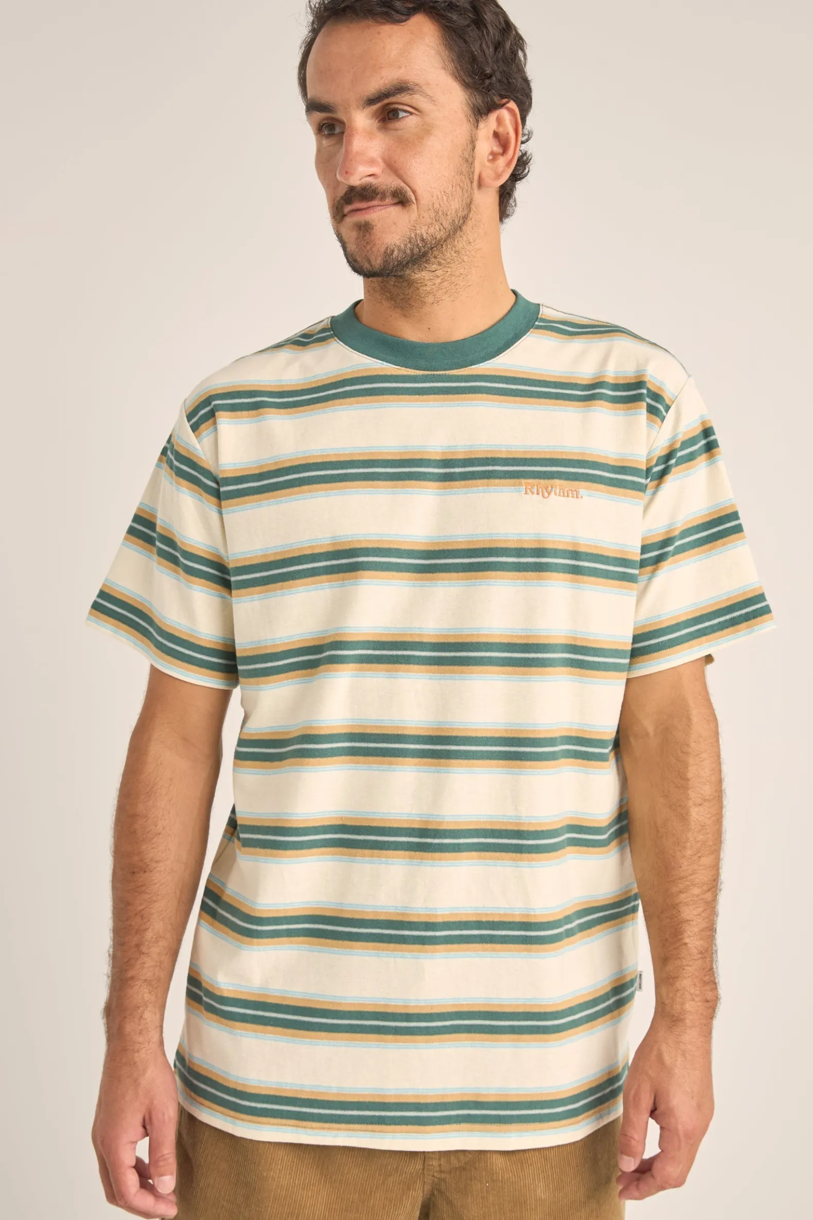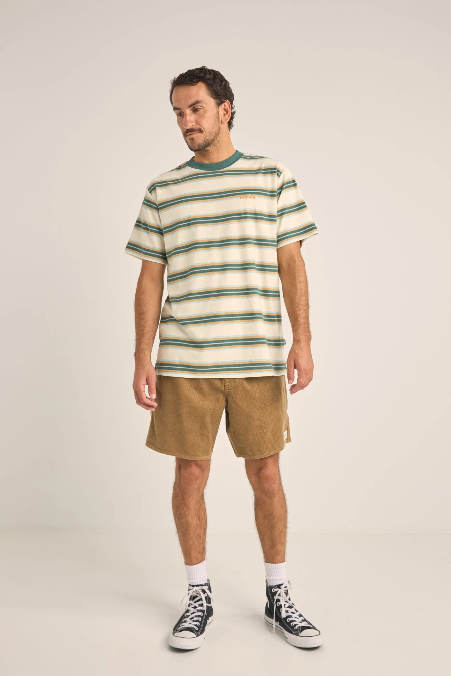 Adorned with an embroidered logo that whispers stories of seaside adventures, the Vintage Green Everyday Stripe SS T-Shirt is a melody of comfort woven into yarn dye stripes. Made from 100% cotton, every thread speaks of softness, brought out by the wash that gives it a hand feel as gentle as the morning tide.