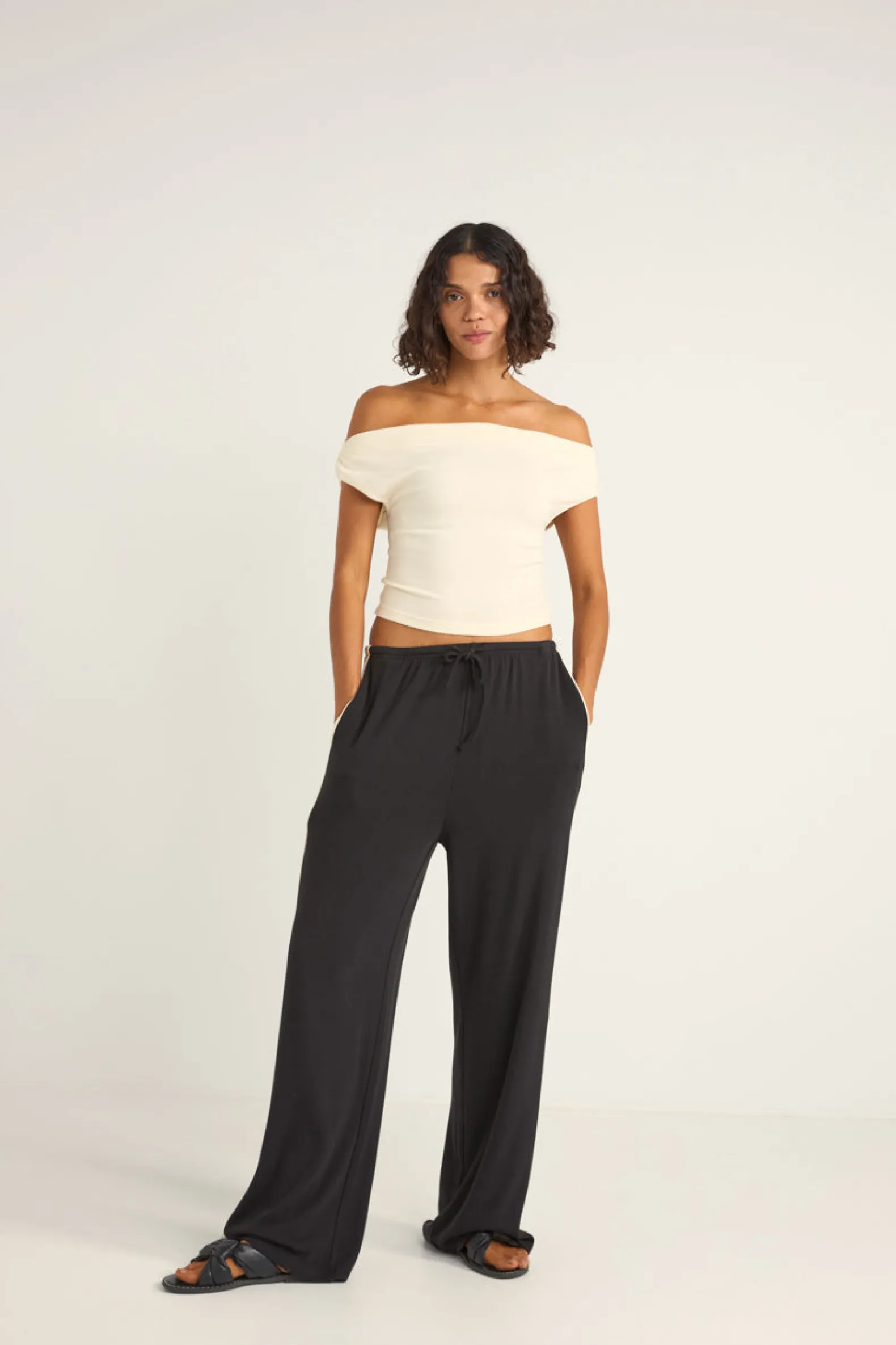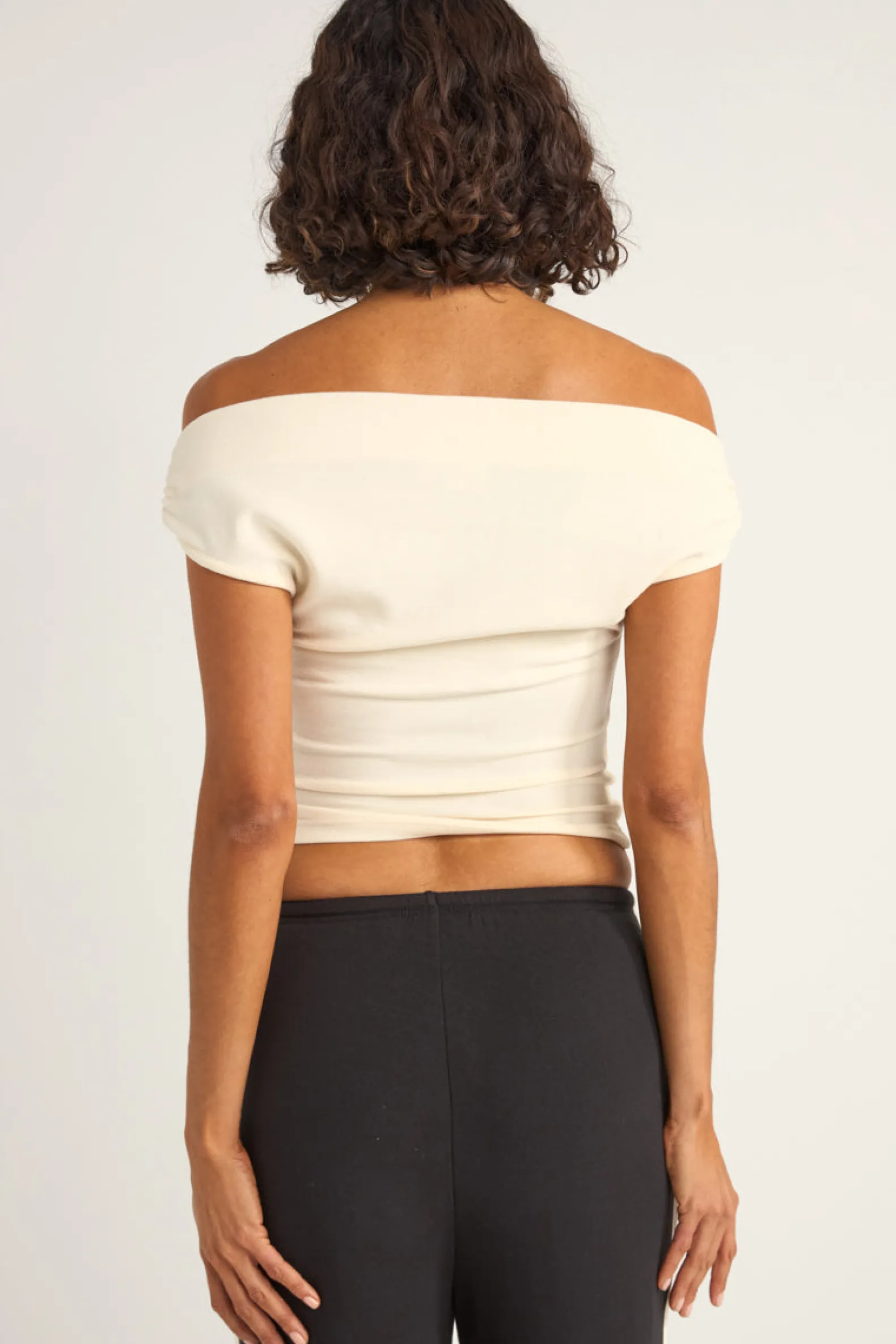 In a soft cream hue, the Juno Off Shoulder Top offers a relaxed fit with gathered shoulders for a touch of romantic flair. Ideal for both day and night.