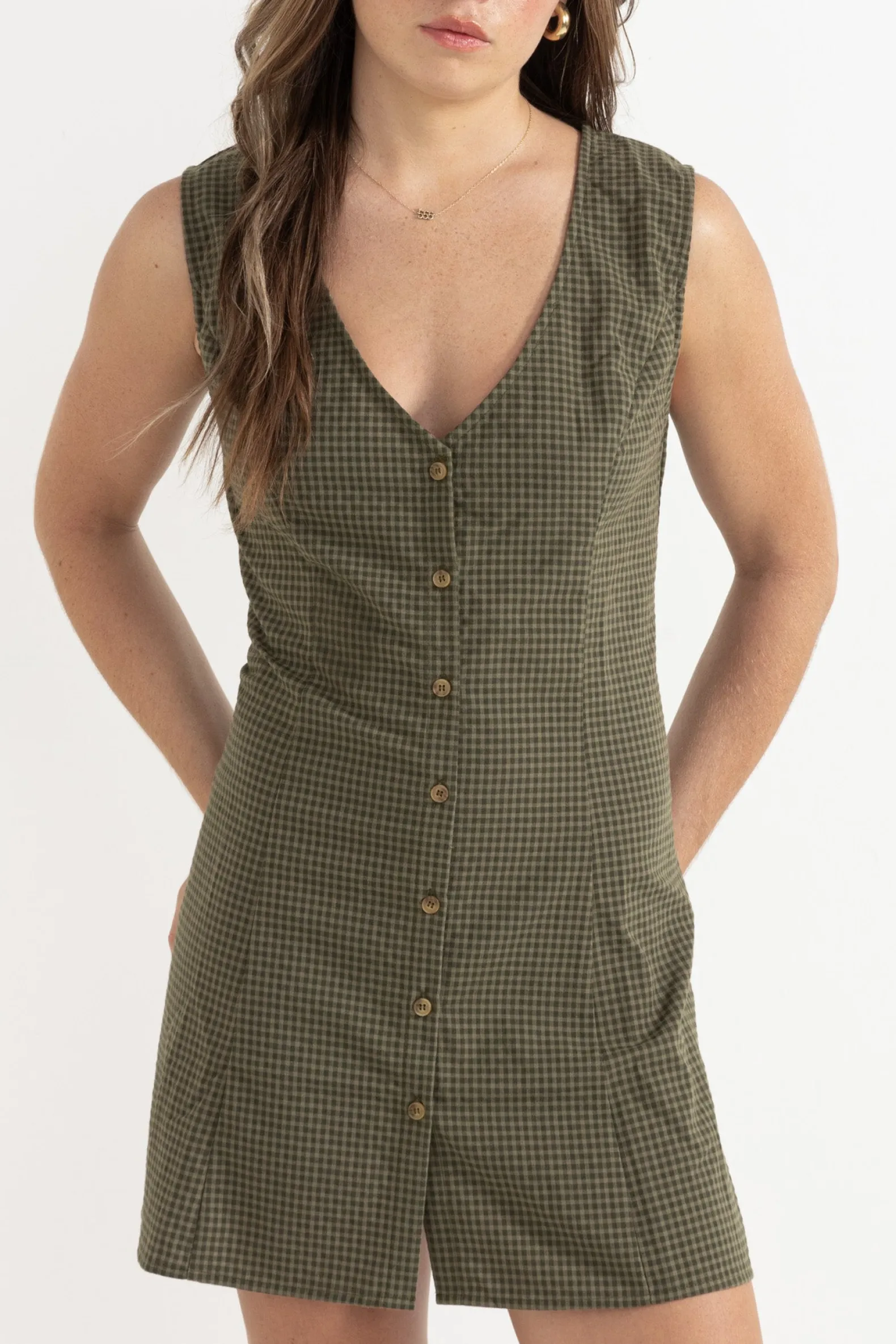 Classic meets modern in the Louise Check Mini Dress in Olive. Featuring a front button closure and back lace tie detail, this dress balances structure with feminine charm for laid-back sophistication.
