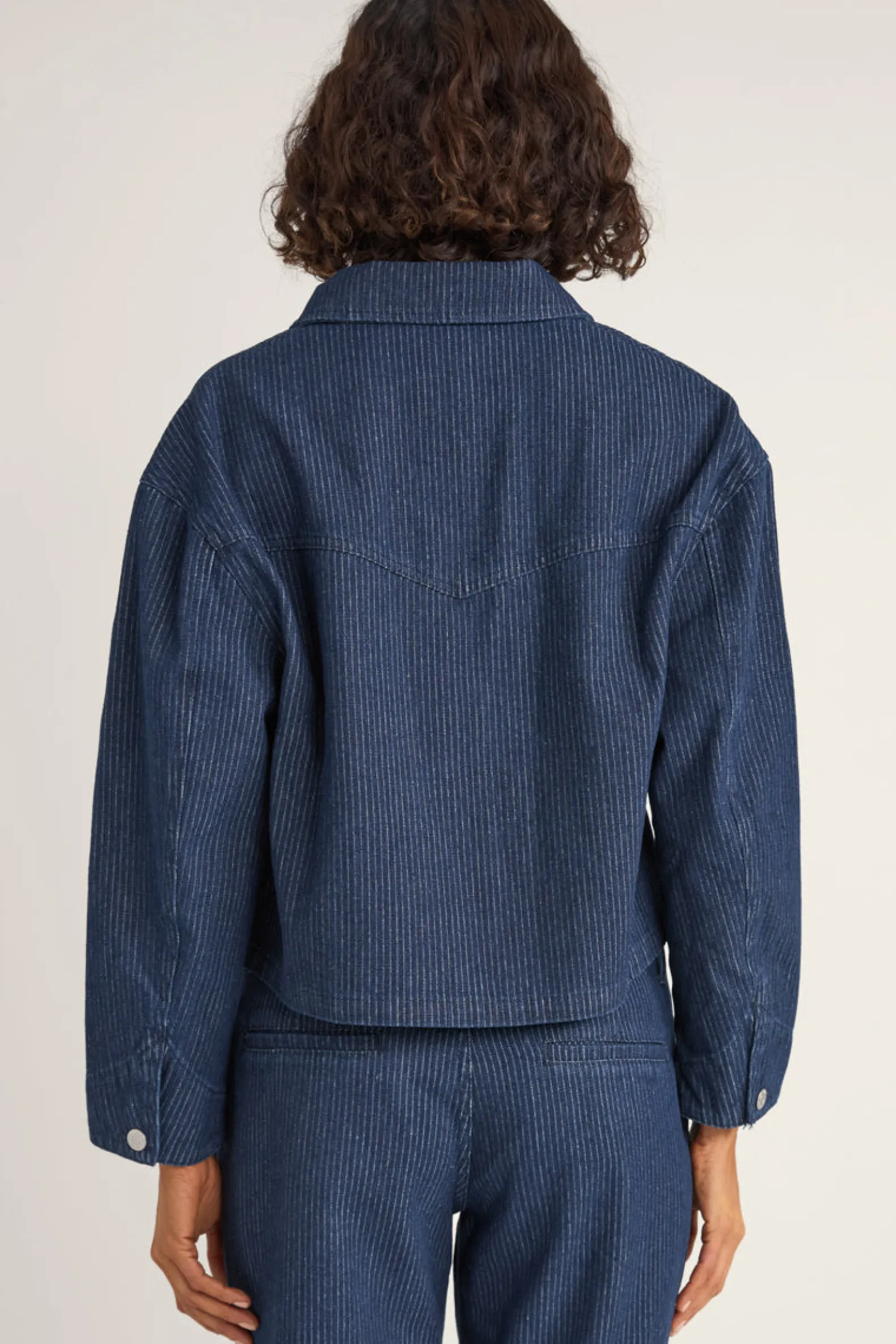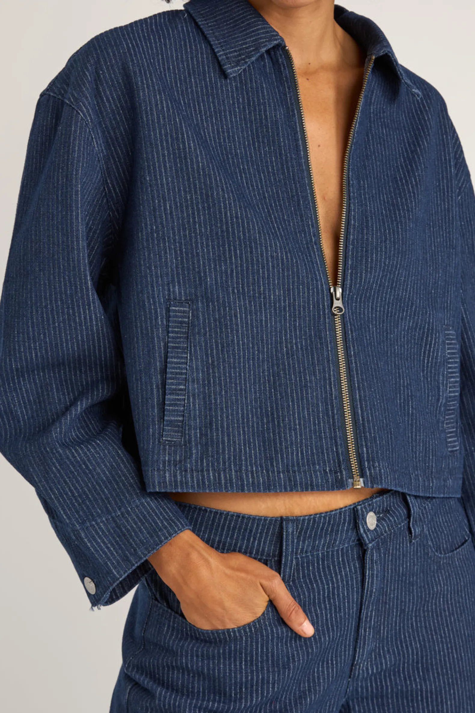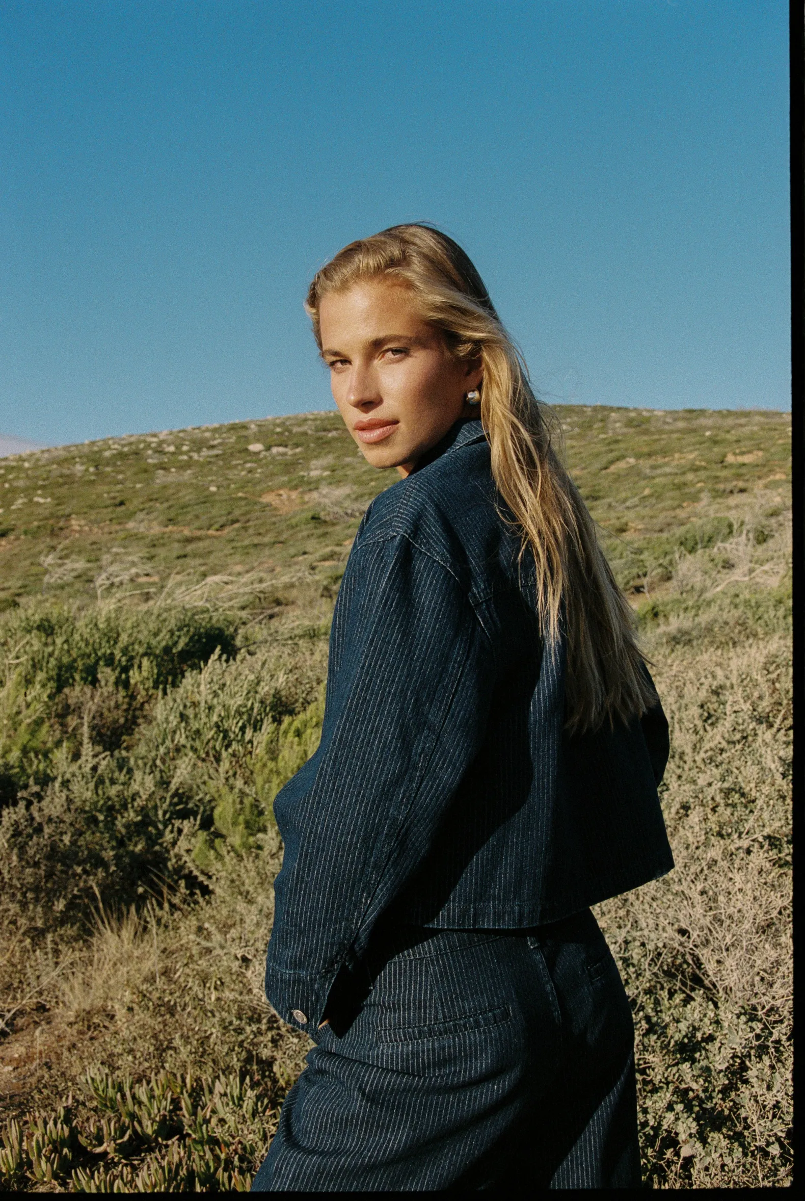 The Pinstripe Cropped Jacket in indigo adds a fresh twist to your outerwear. Its boxy fit and subtle pinstripes make it a versatile piece for layering.
