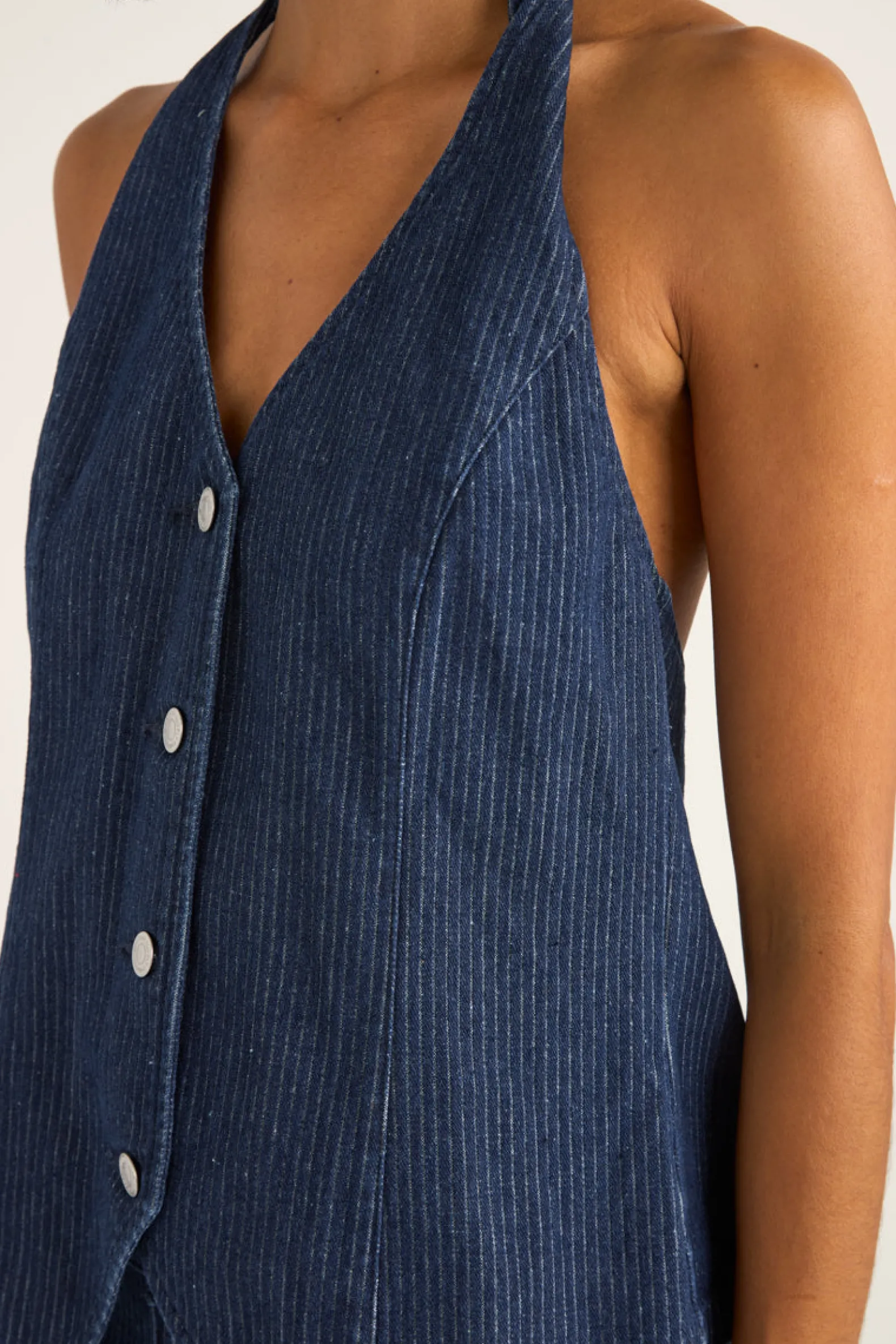 Classic coastal style meets versatility in the Pinstripe Halter Vest. Made from soft denim with an adjustable back tie and front buttons, it’s an easy piece to layer or wear solo.