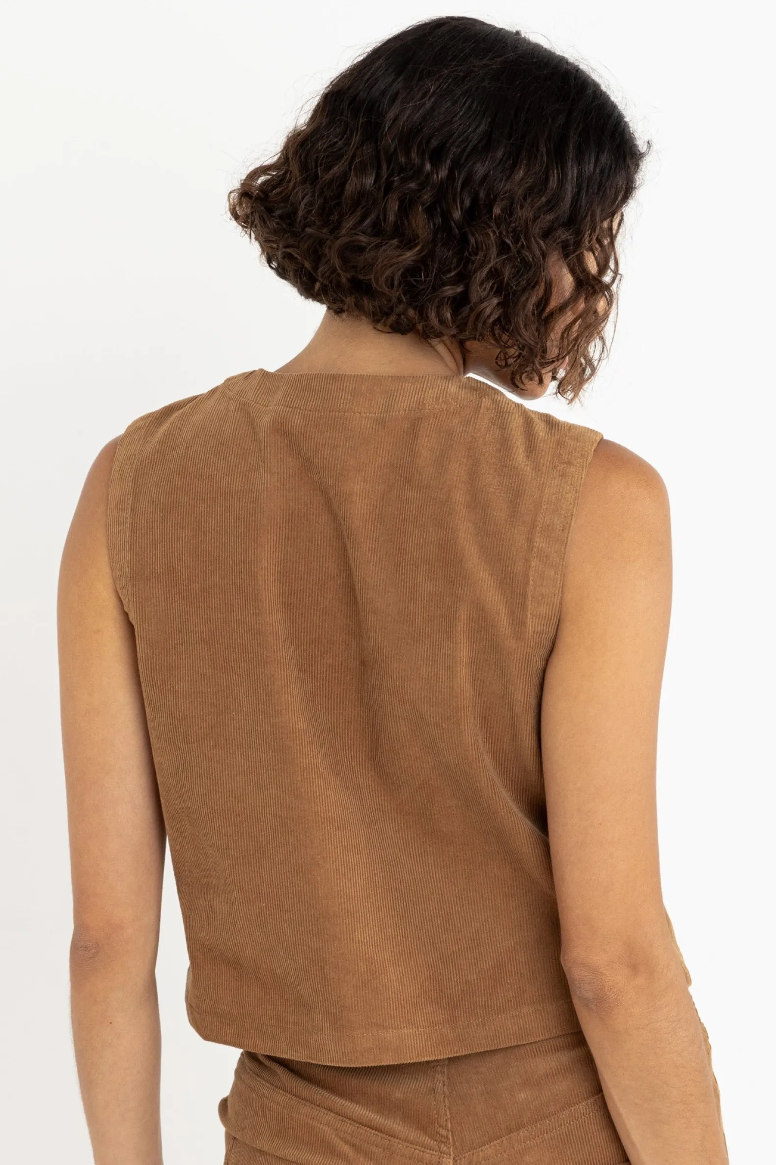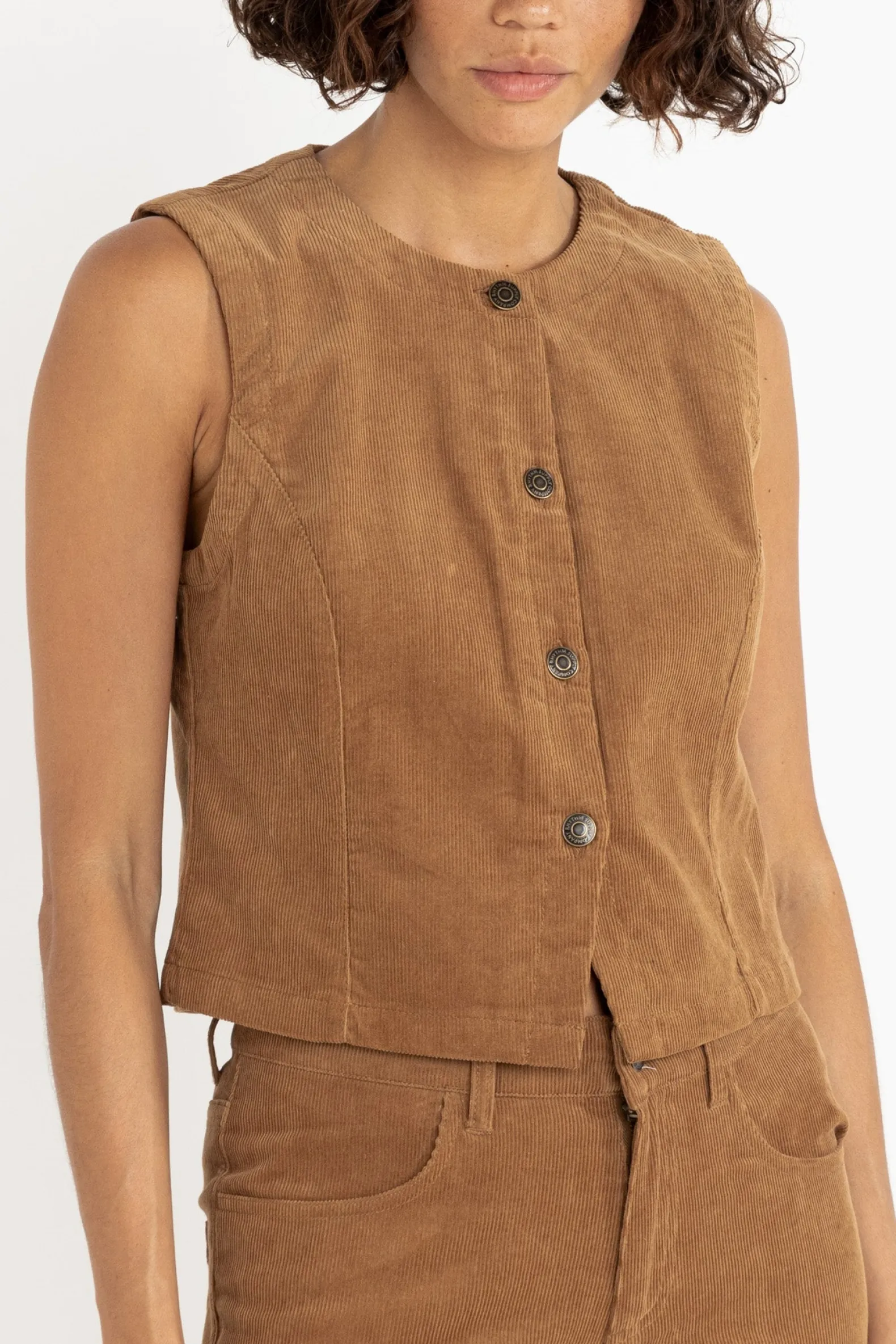 Refined yet relaxed, the Sadie Corduroy Vest in Cedar offers a fitted silhouette with classic metal button closures. Perfect for layering, it blends timeless style with modern versatility for cooler days by the coast.