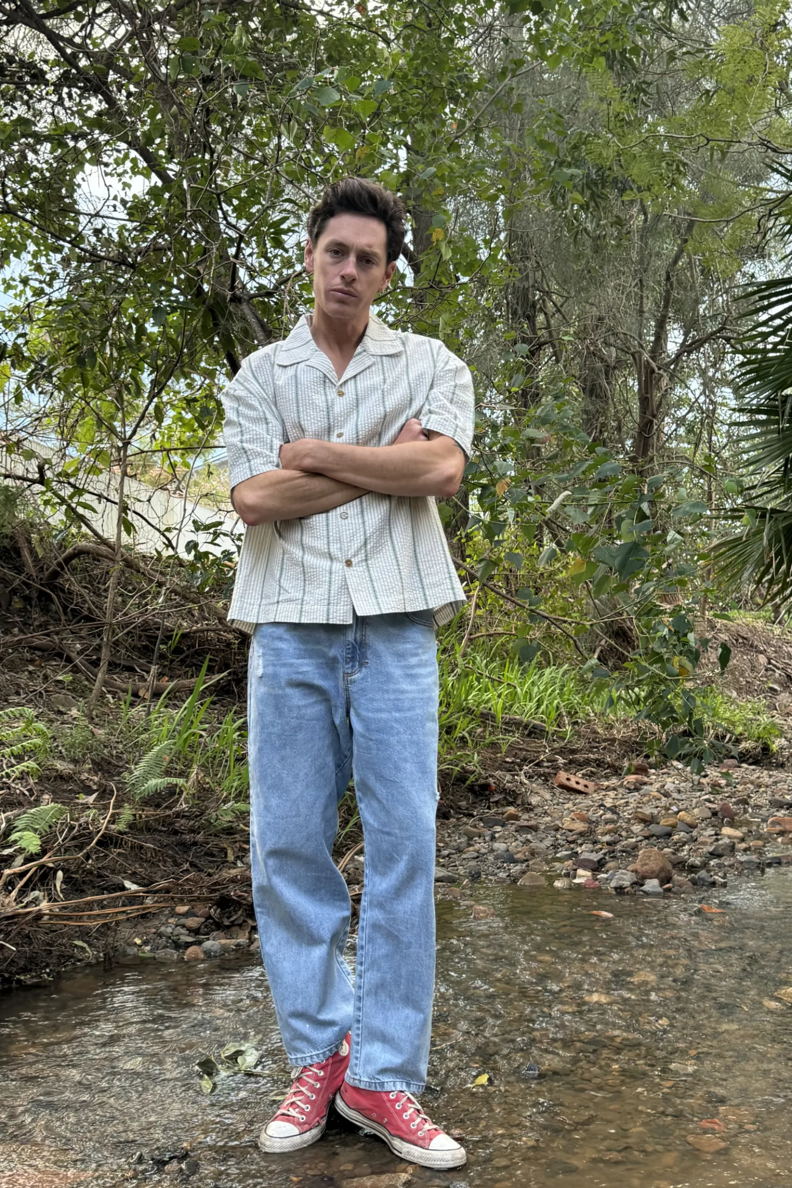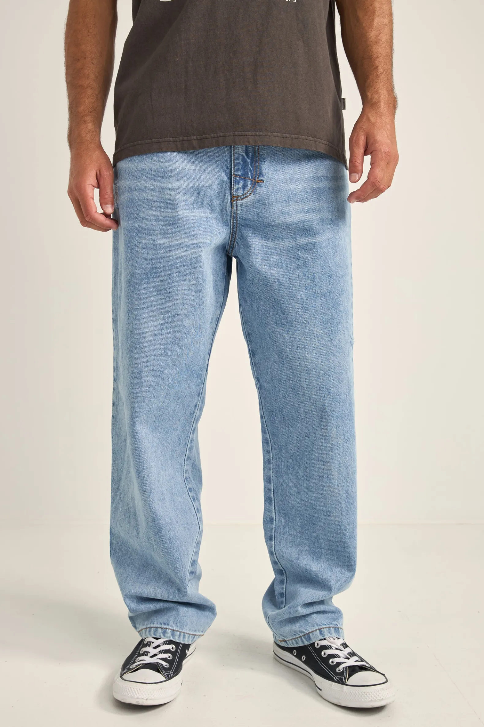 Discover laid-back coastal style with our Subtle Distress Jeans in Blue. These wide loose-fit pants feature a 41-inch outseam, light blue colorway with a light wash, metal button and fly closure, subtle distressing details, and signature Rhythm trims. Perfect for relaxed, everyday wear.