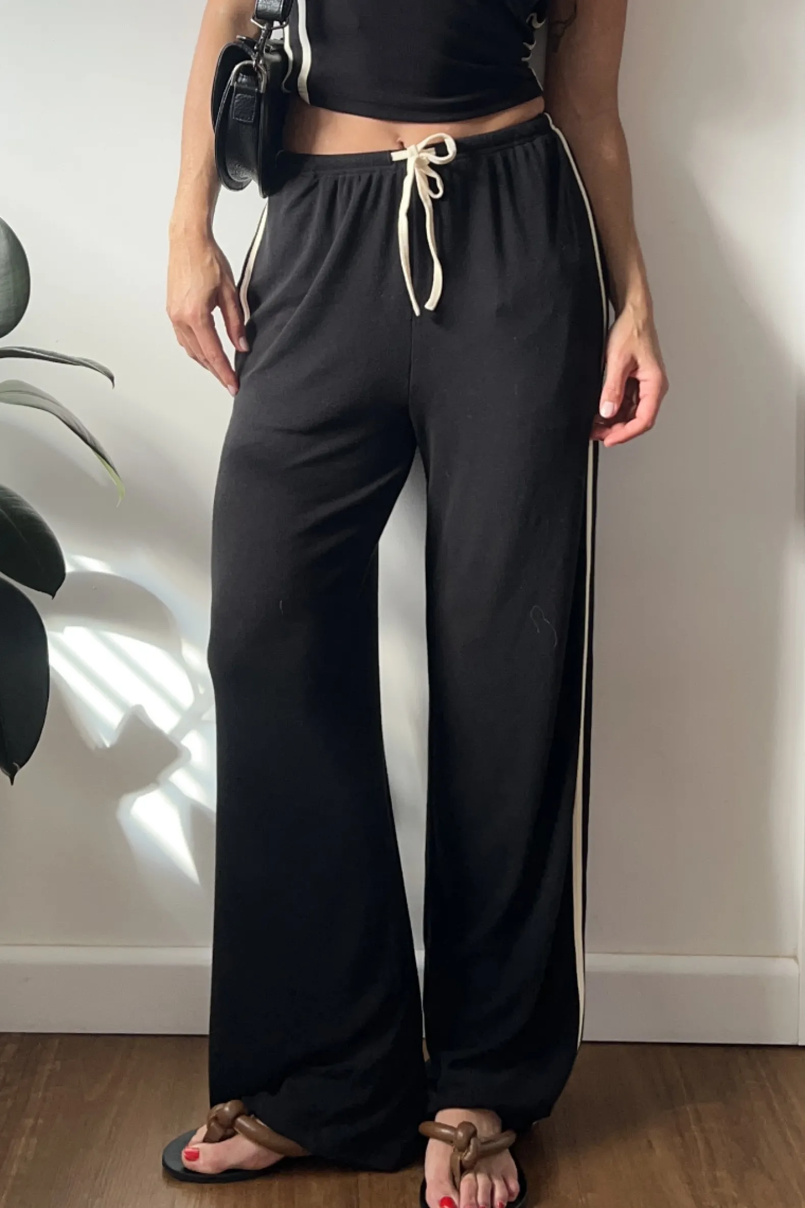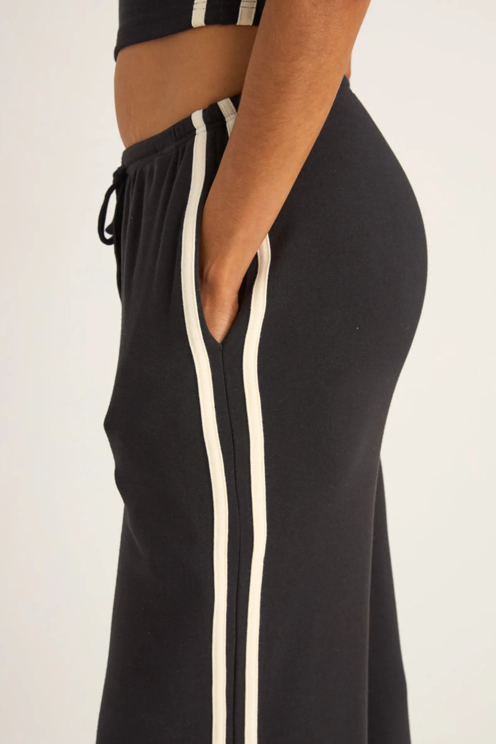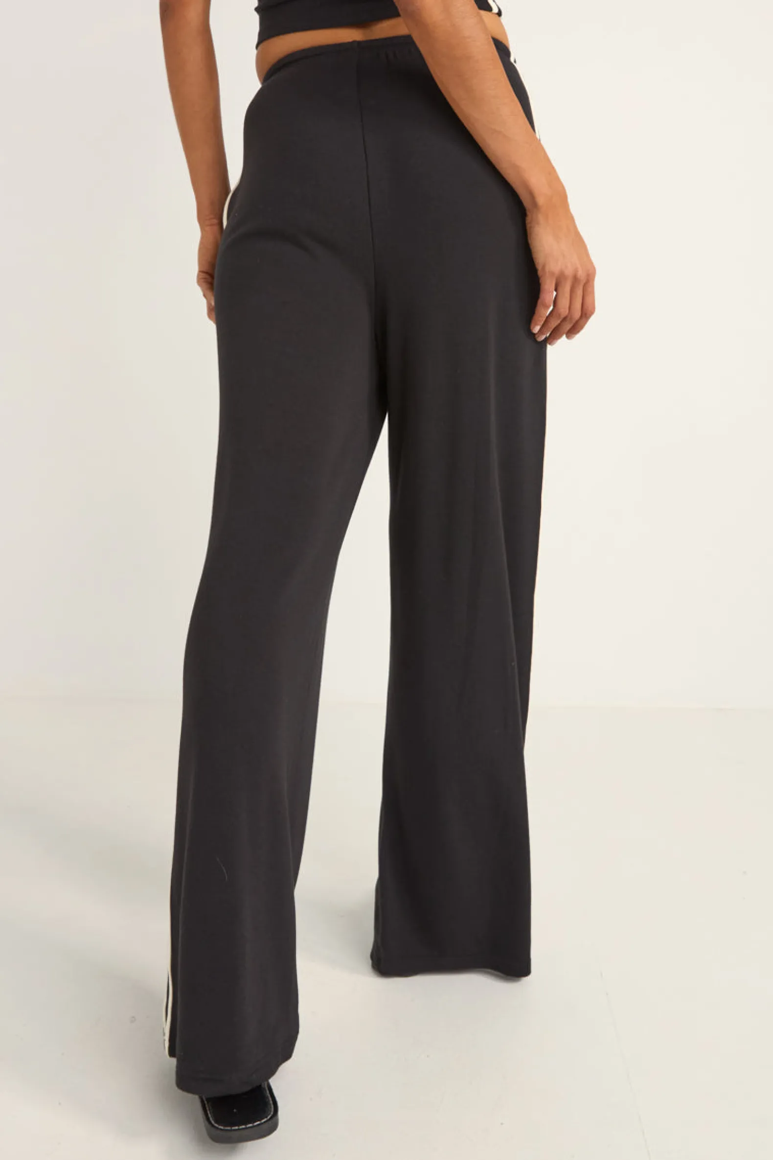 The Track Pant in Black features a relaxed high waist and straight leg, offering both style and comfort. Ideal for a sleek, sporty look.