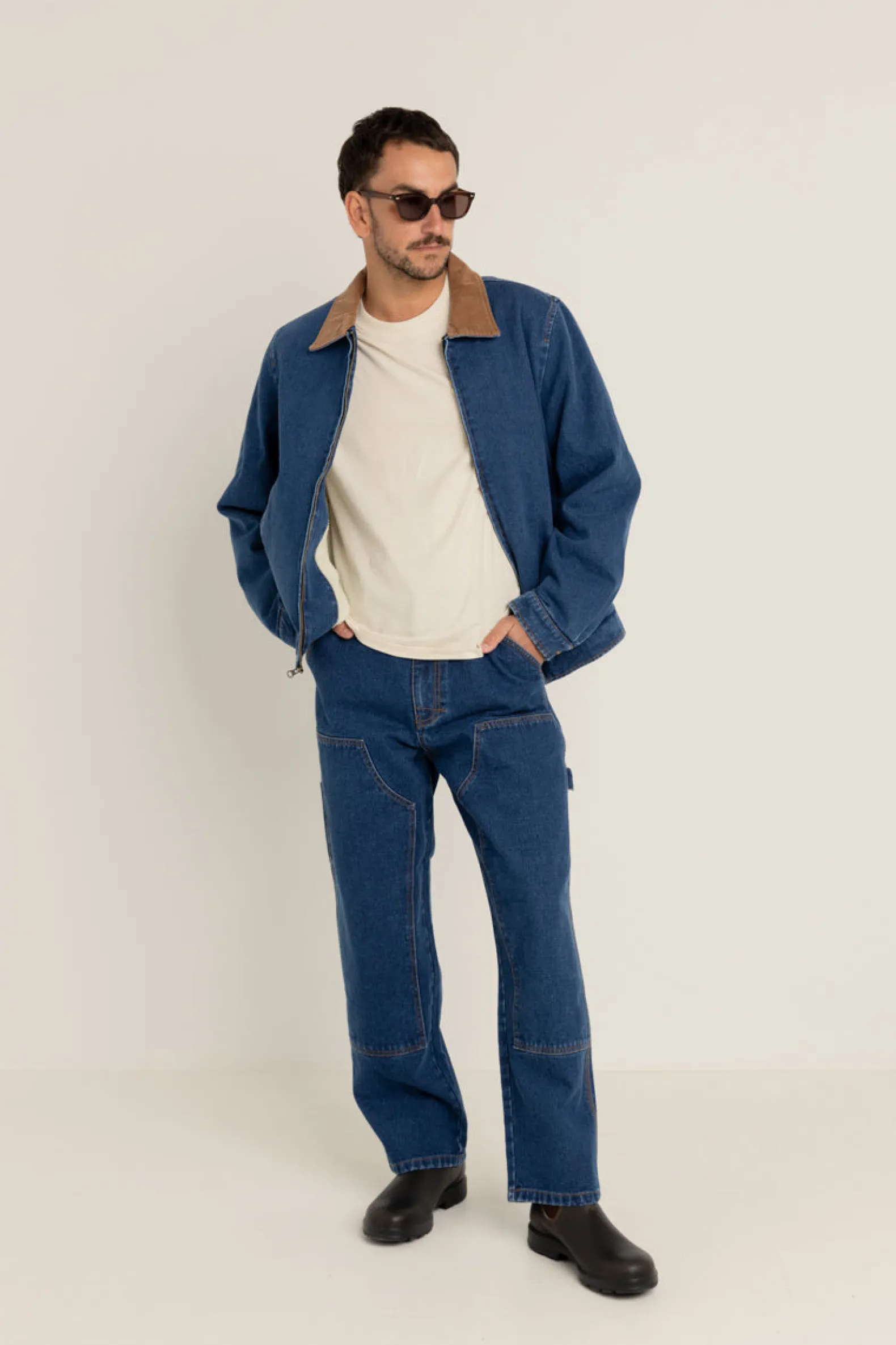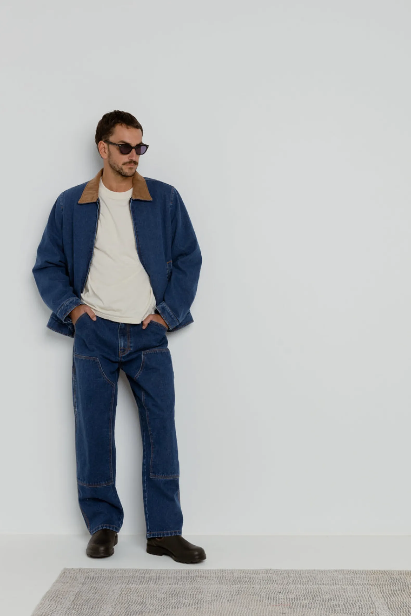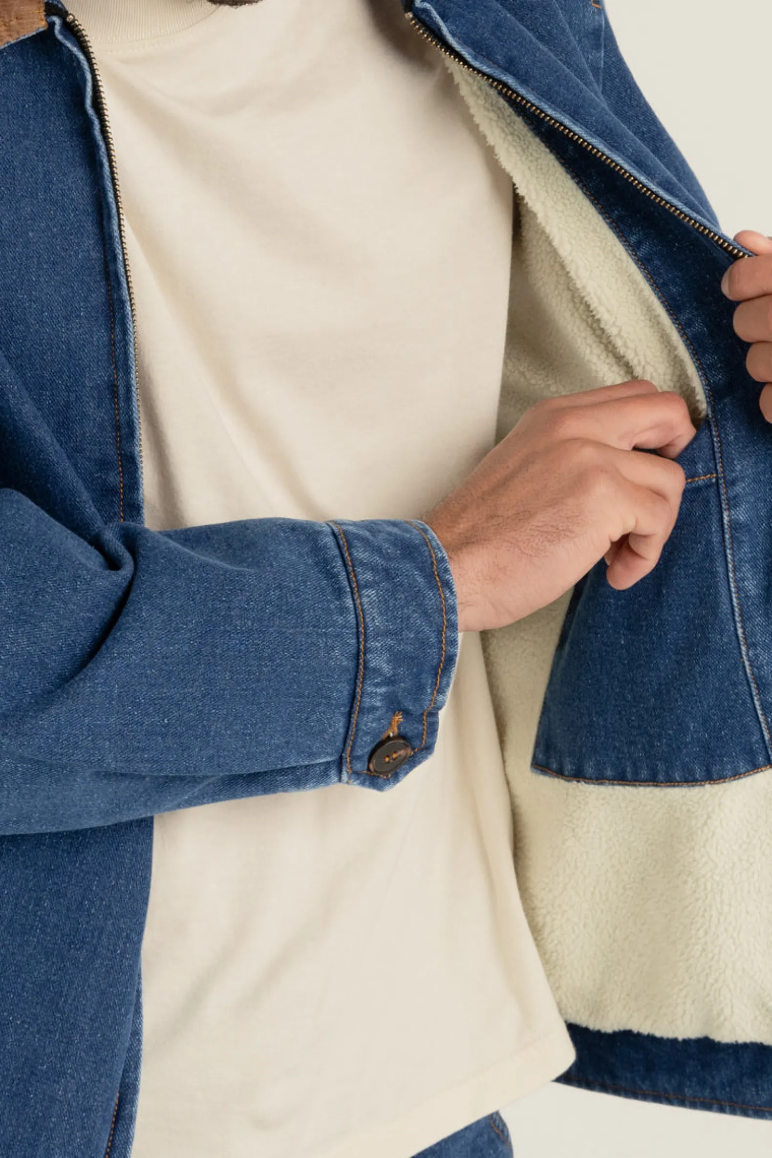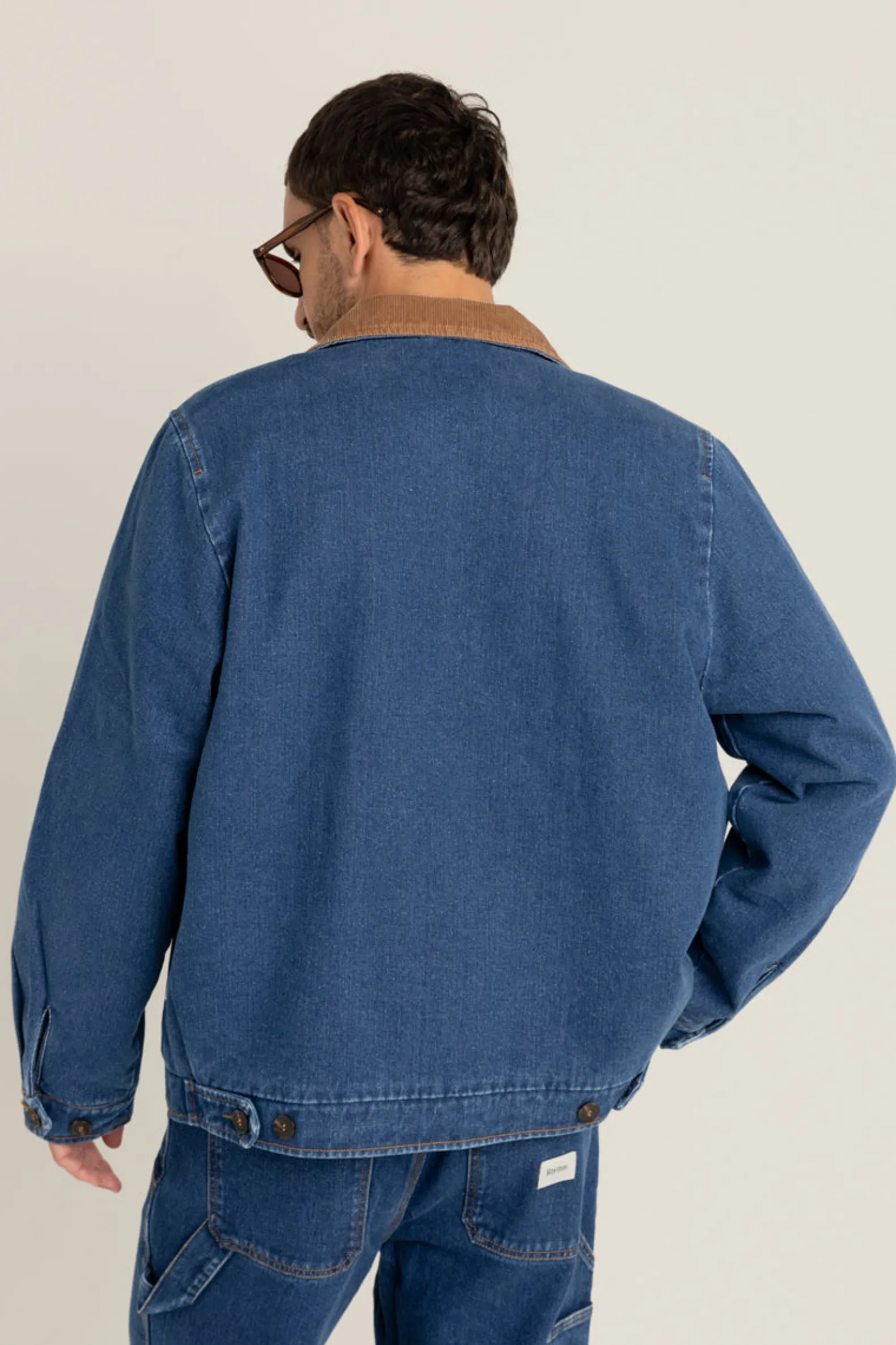 A heavy-weight washed denim jacket with a contrast cord collar, branded trims, and a button-down front. Vintage-inspired for effortless coastal layering.